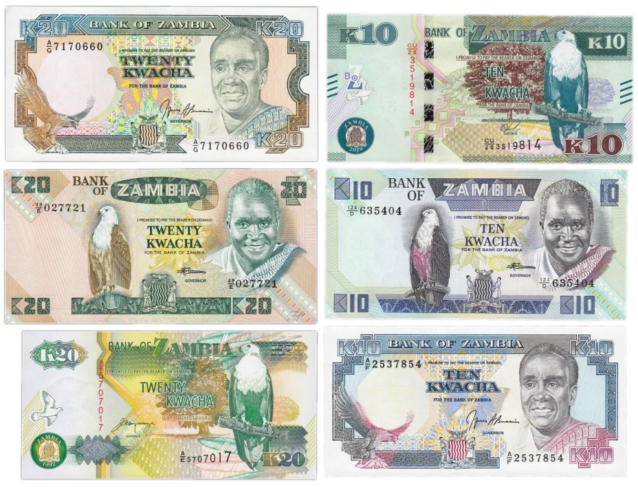 Замбия набор из 6 банкнот 10 и 20 квача 1992-2020