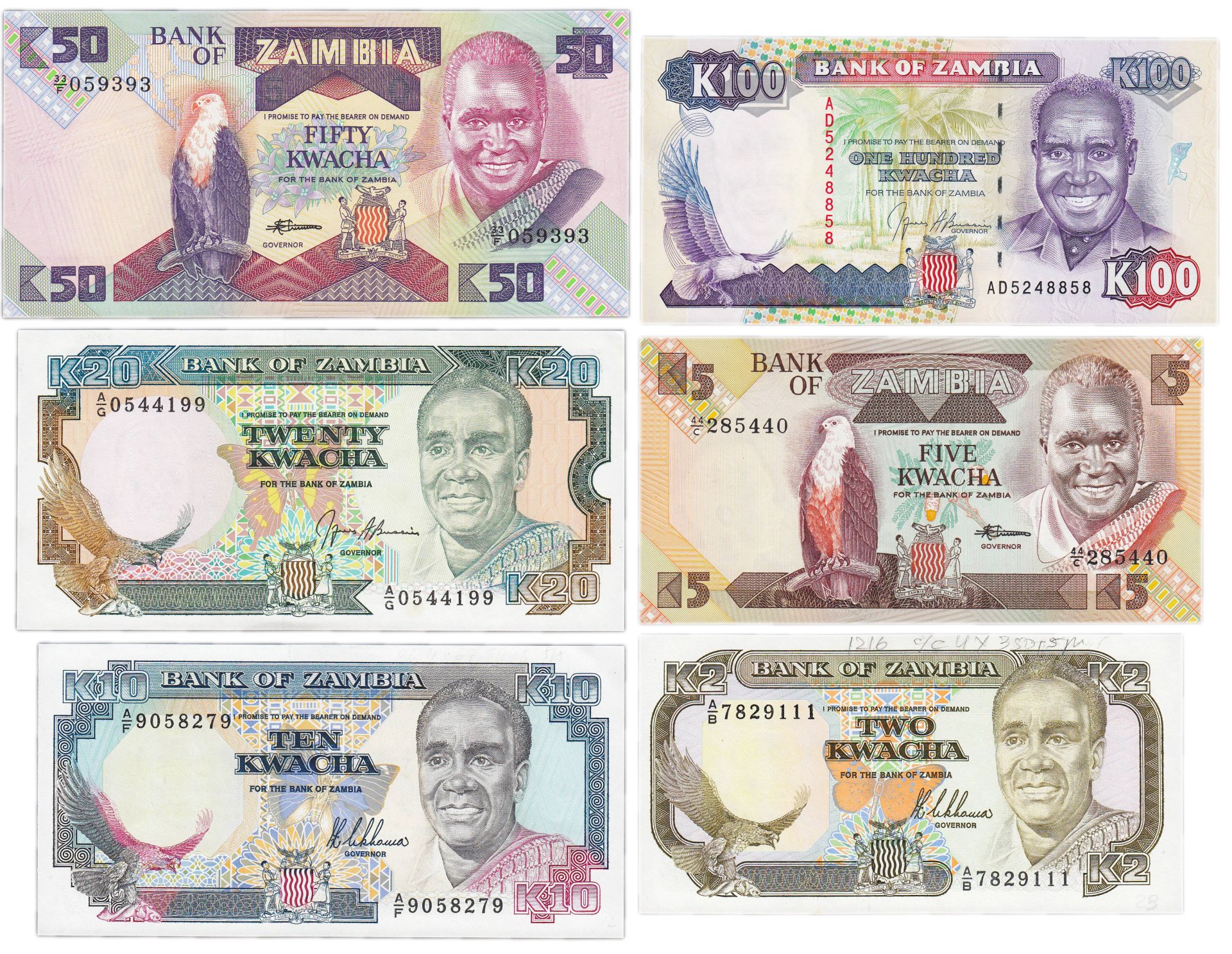 Замбия набор из 6 банкнот 2, 5, 10, 20, 50, 100 квача 1980-1988
