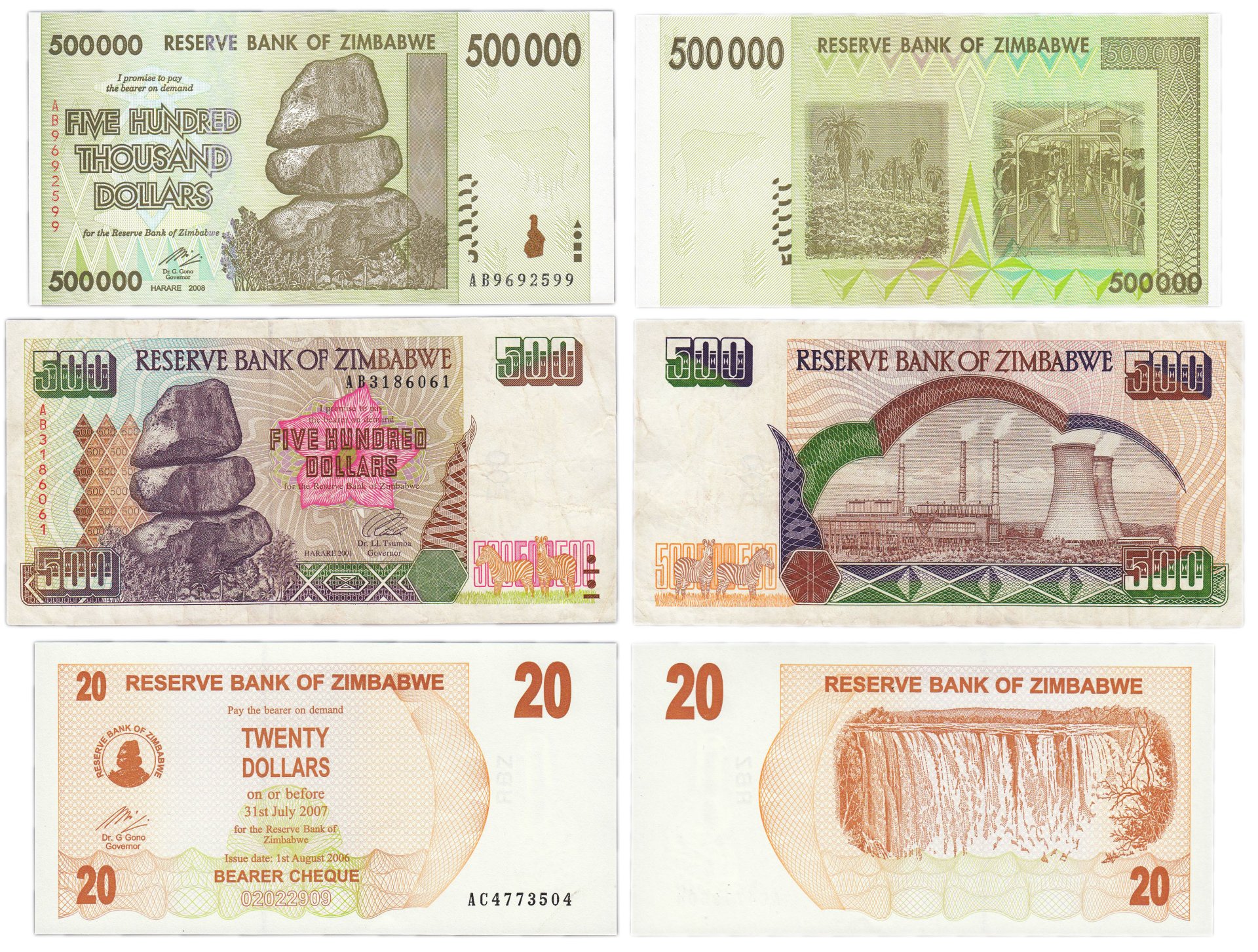 Купить Зимбабве набор из 3 банкнот 20, 500, 500000 долларов 2001-2008
