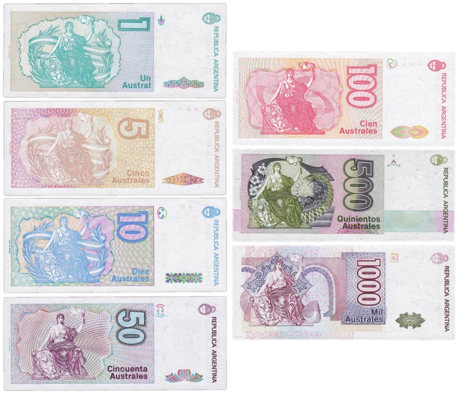 Аргентина - набор 7 шт - 1, 5, 10, 50, 100, 500, 1000 аустраль 1985 - 1991 год Pick 323 324 325 326-329