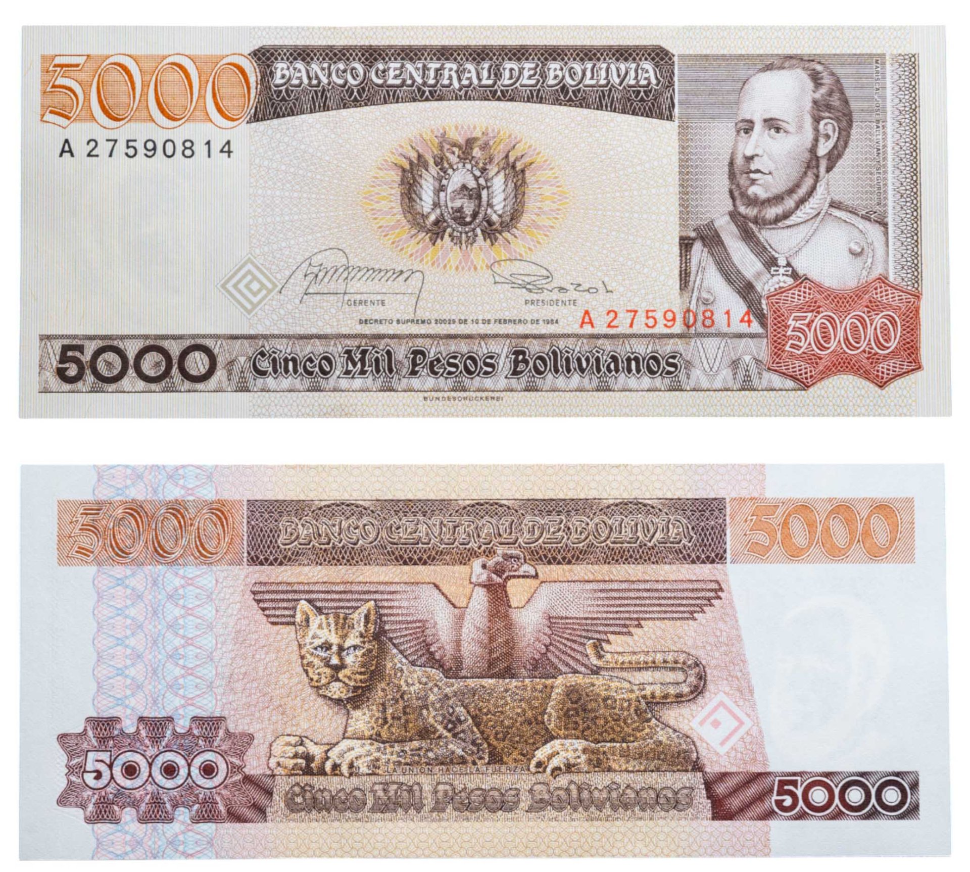 Боливия 5000 песо боливиано 1984 года