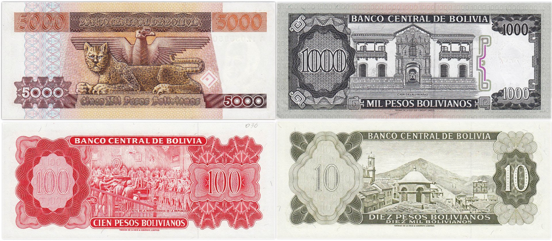 Боливия набор из 4 банкнот 10, 100, 1000. 5000 песо боливиано 1962-1984