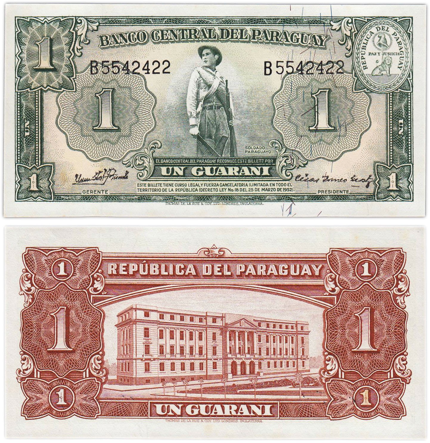 купить Парагвай 1 гуарани 1952 год PIck 185c(2) Серия B черный номер