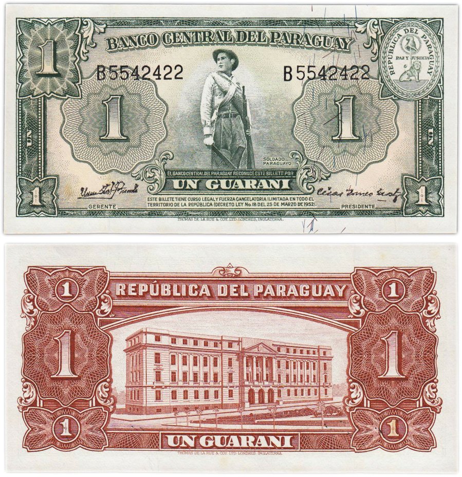 Купить Парагвай 1 гуарани 1952 год PIck 185c(2) Серия B черный номер