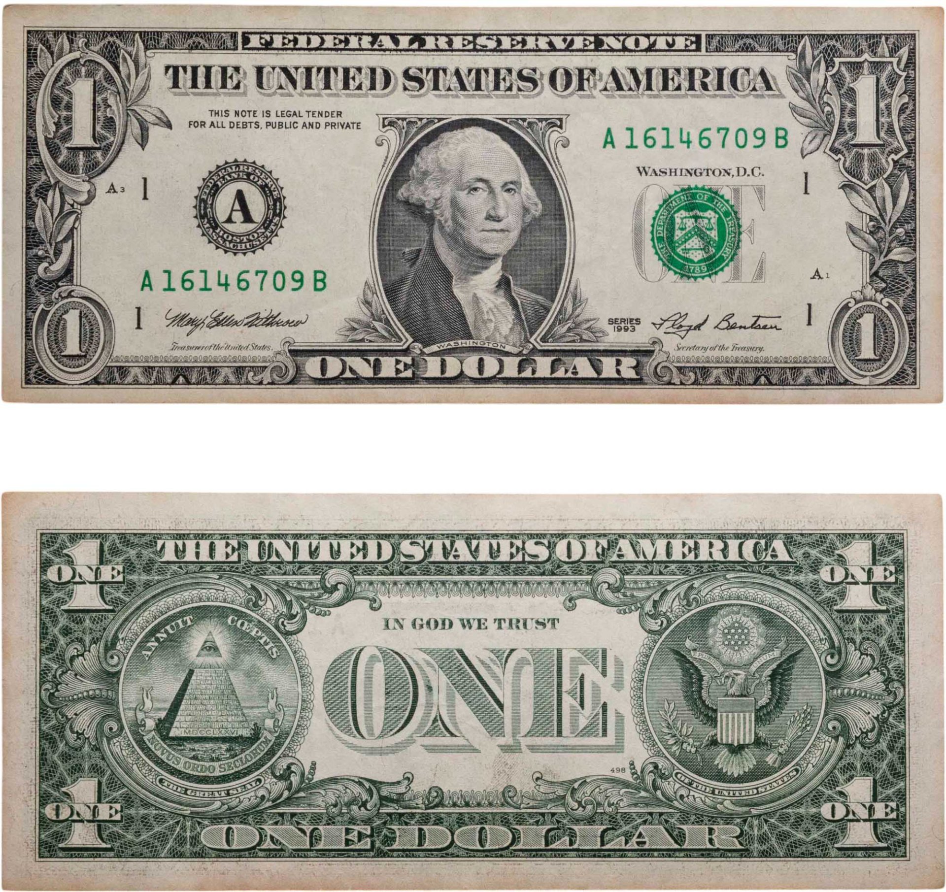 На протяжении истории внешний вид купюры менялся. Свой нынешний облик он получил в 1928 году. Русский мигрант, художник Сергей Макроновский предложил оформление с изображением на купюрах выдающихся американских деятелей, а также государственную эмблему орлана с веткой оливы, недостроенную пирамиду, со всевидящим оком.