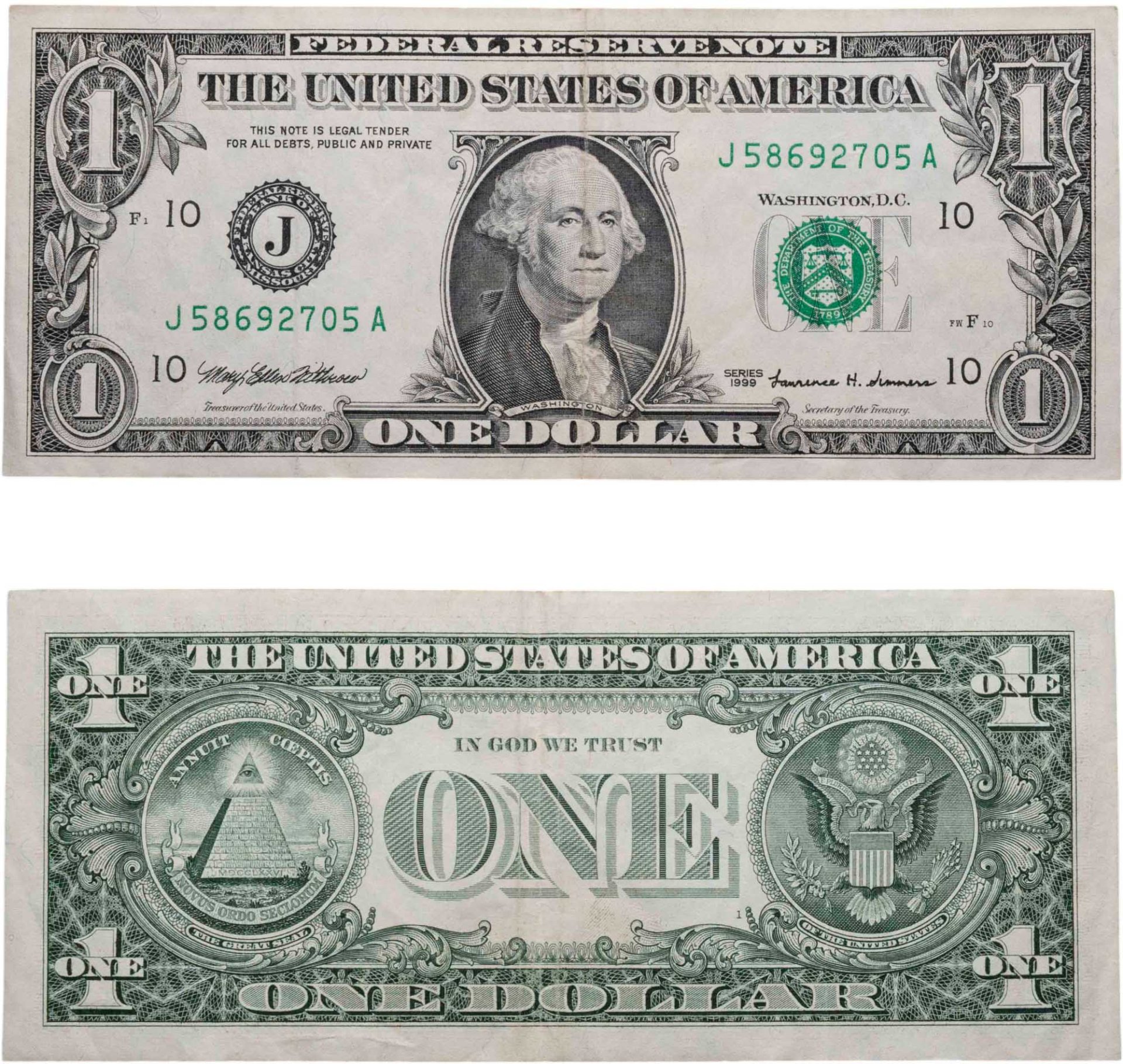 На протяжении истории внешний вид купюры менялся. Свой нынешний облик он получил в 1928 году. Русский мигрант, художник Сергей Макроновский предложил оформление с изображением на купюрах выдающихся американских деятелей, а также государственную эмблему орлана с веткой оливы, недостроенную пирамиду, со всевидящим оком.