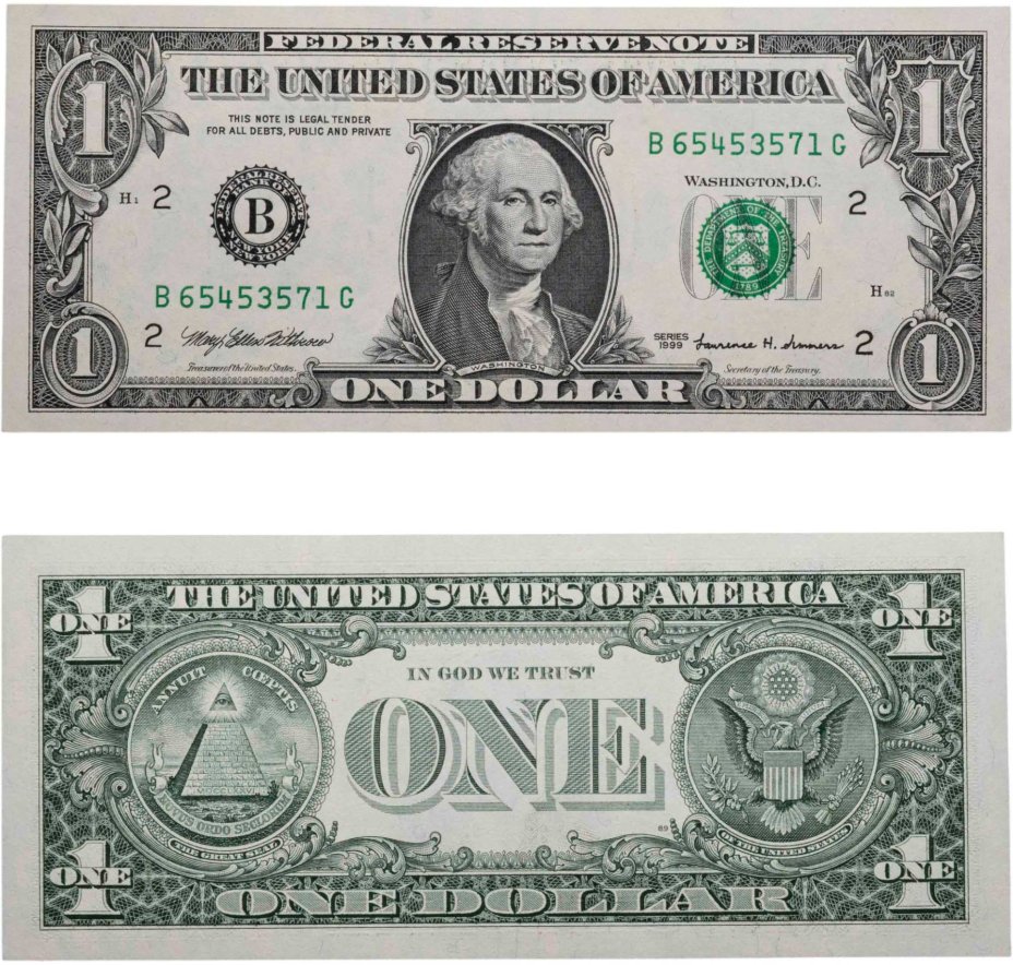 На протяжении истории внешний вид купюры менялся. Свой нынешний облик он получил в 1928 году. Русский мигрант, художник Сергей Макроновский предложил оформление с изображением на купюрах выдающихся американских деятелей, а также государственную эмблему орлана с веткой оливы, недостроенную пирамиду, со всевидящим оком.