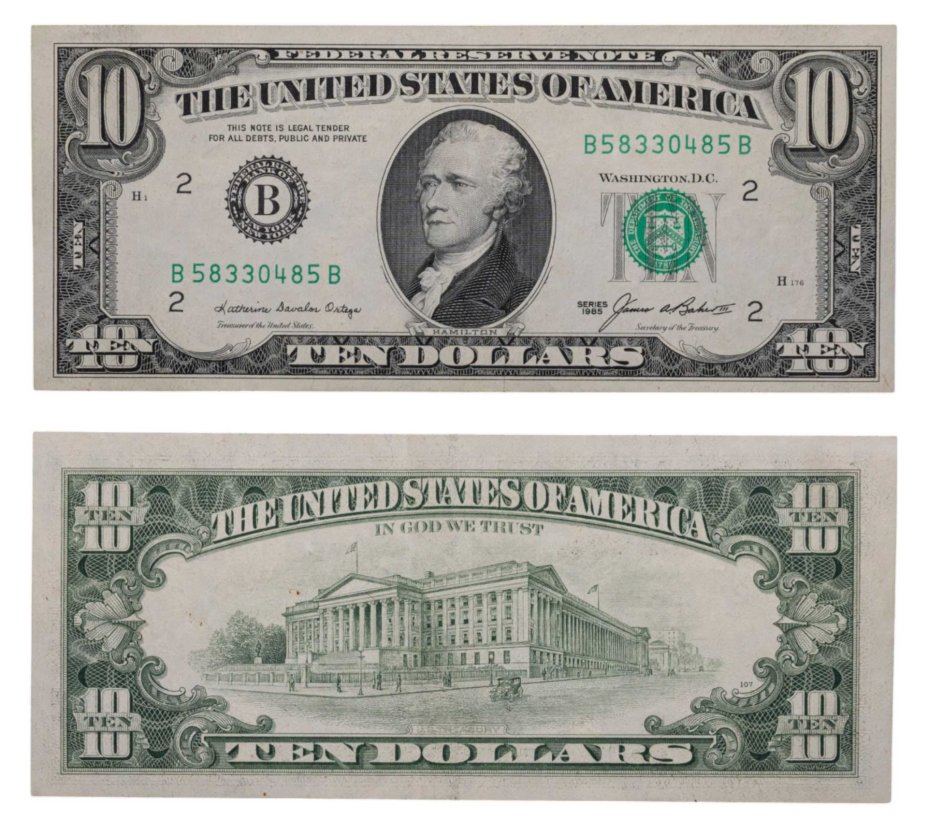 • Серия: зеленая печать справа, обычный номер серии, напечатанный зеленым цветом;