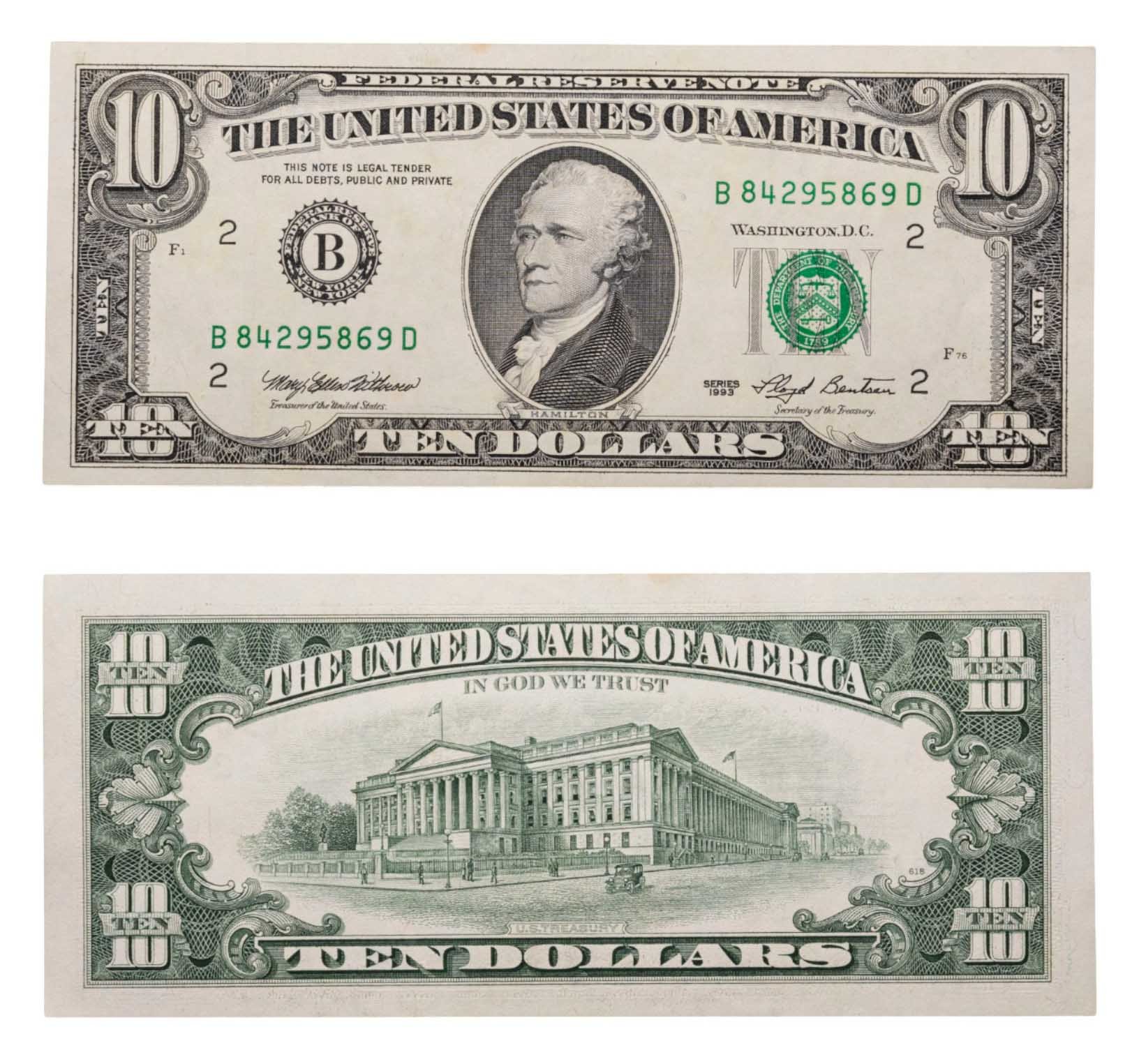 На протяжении истории внешний вид купюры менялся. Свой нынешний облик он получил в 1928 году. Русский мигрант, художник Сергей Макроновский предложил оформление с изображением на купюрах выдающихся американских деятелей, а также государственную эмблему орлана с веткой оливы, недостроенную пирамиду, со всевидящим оком.