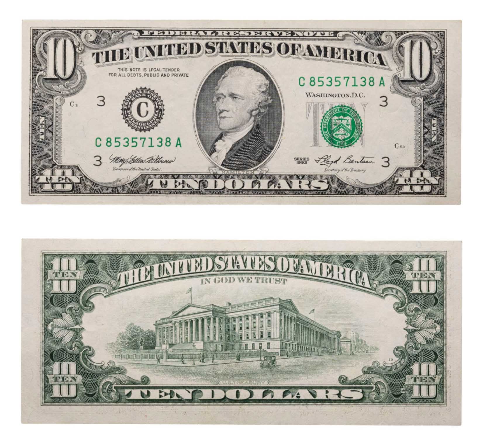 На протяжении истории внешний вид купюры менялся. Свой нынешний облик он получил в 1928 году. Русский мигрант, художник Сергей Макроновский предложил оформление с изображением на купюрах выдающихся американских деятелей, а также государственную эмблему орлана с веткой оливы, недостроенную пирамиду, со всевидящим оком.