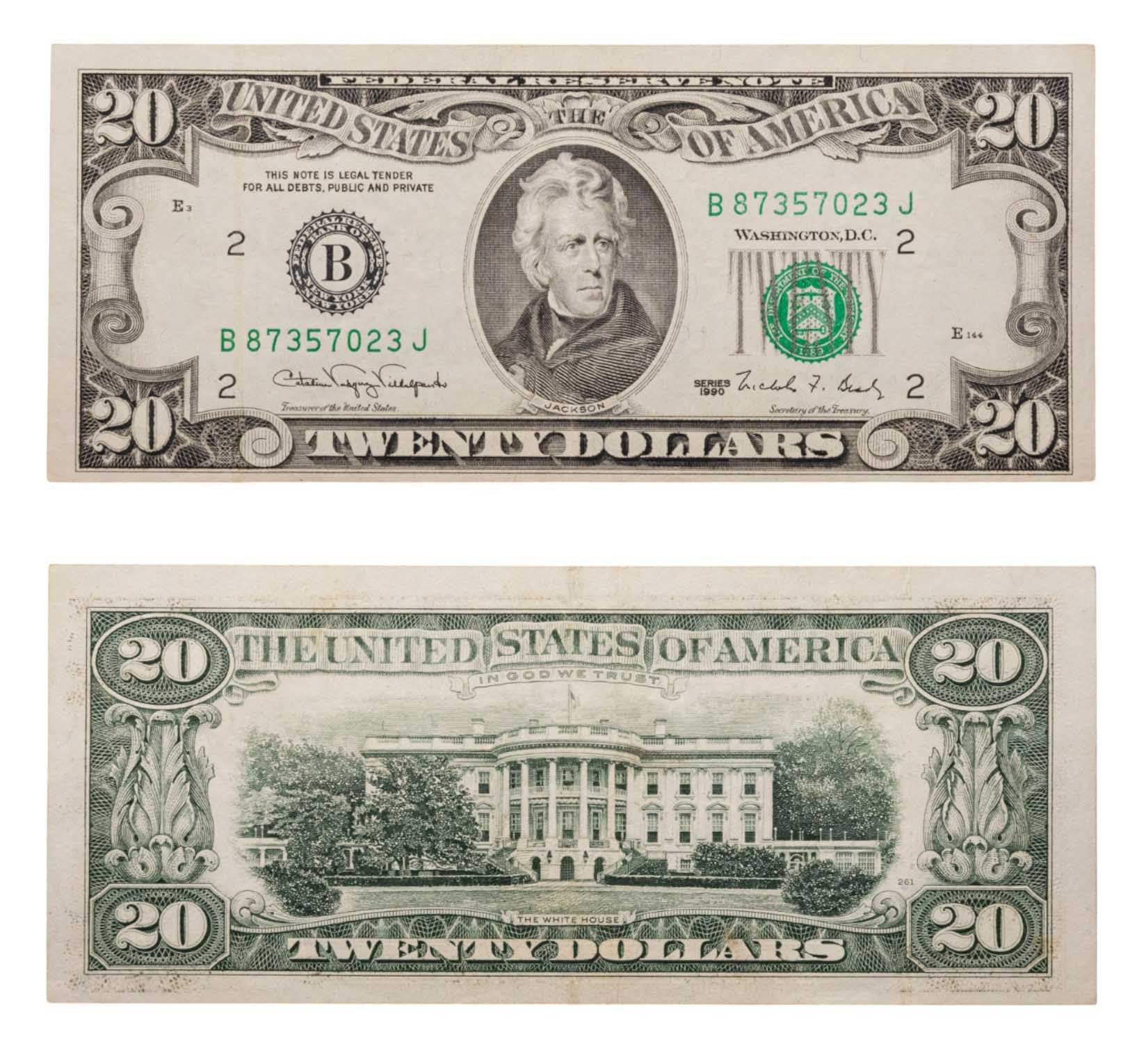 На протяжении истории внешний вид купюры менялся. Свой нынешний облик он получил в 1928 году. Русский мигрант, художник Сергей Макроновский предложил оформление с изображением на купюрах выдающихся американских деятелей, а также государственную эмблему орлана с веткой оливы, недостроенную пирамиду, со всевидящим оком.