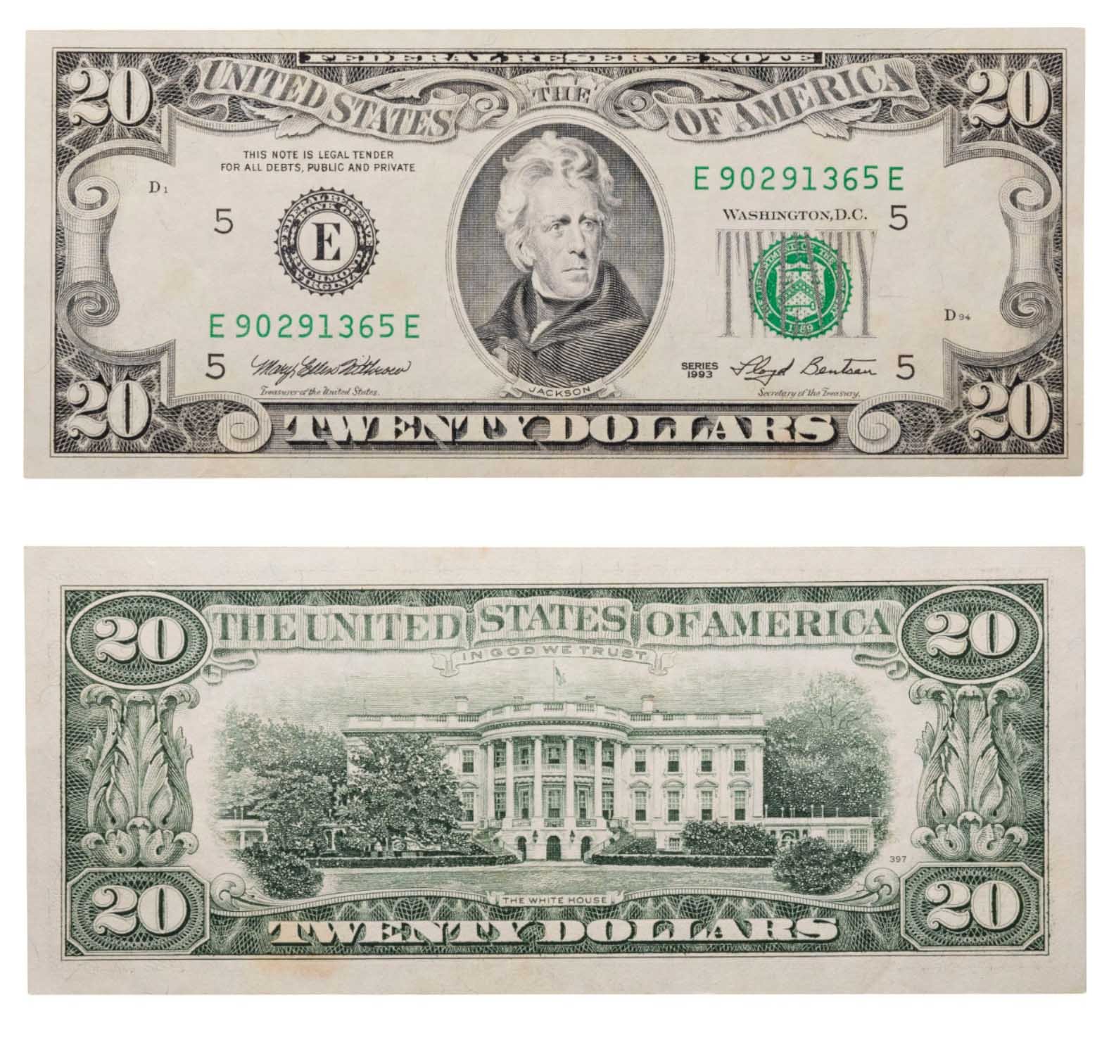 На протяжении истории внешний вид купюры менялся. Свой нынешний облик он получил в 1928 году. Русский мигрант, художник Сергей Макроновский предложил оформление с изображением на купюрах выдающихся американских деятелей, а также государственную эмблему орлана с веткой оливы, недостроенную пирамиду, со всевидящим оком.