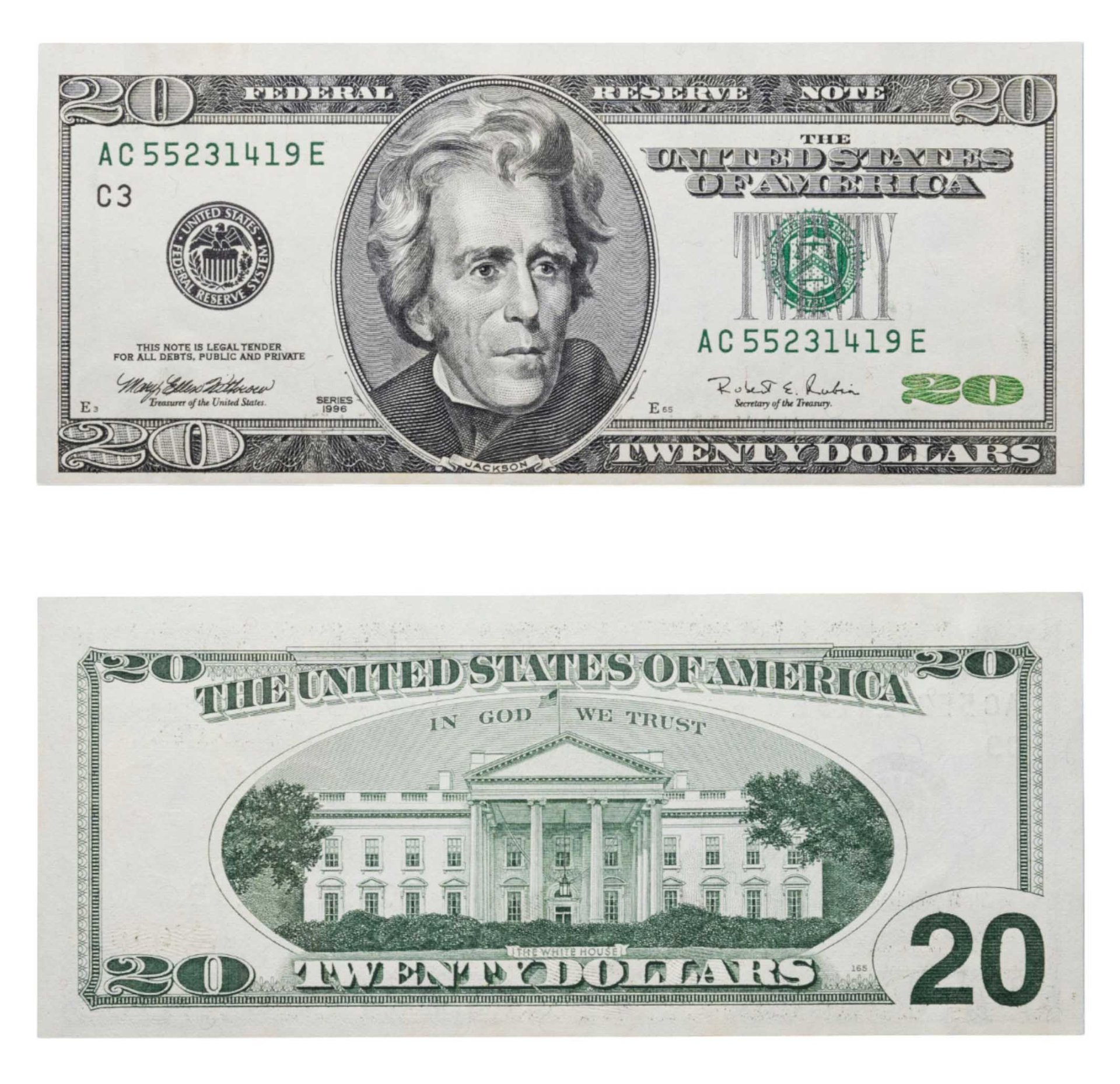На протяжении истории внешний вид купюры менялся. Свой нынешний облик он получил в 1928 году. Русский мигрант, художник Сергей Макроновский предложил оформление с изображением на купюрах выдающихся американских деятелей, а также государственную эмблему орлана с веткой оливы, недостроенную пирамиду, со всевидящим оком.