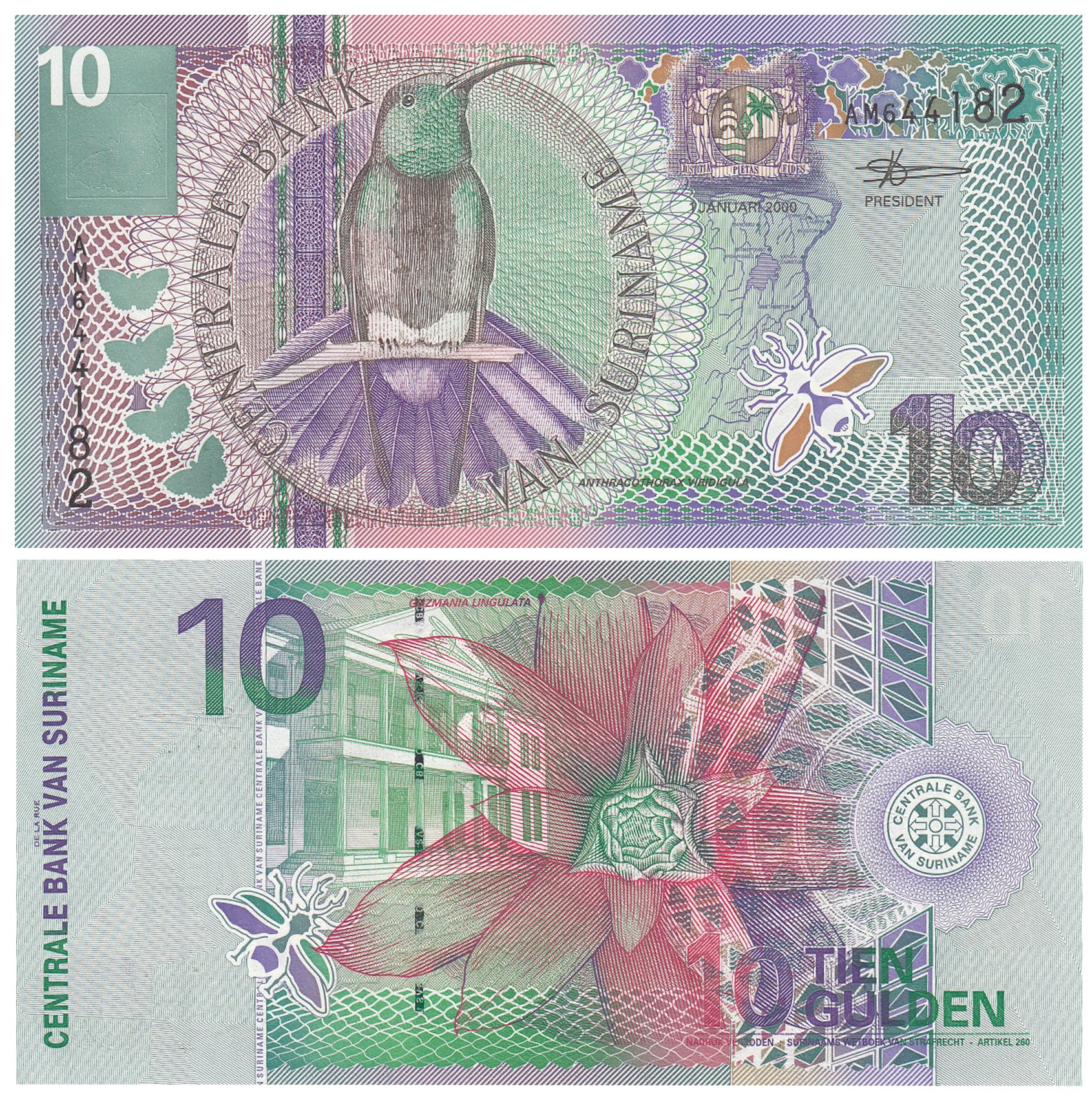 Суринам 10 гульденов 2000 (Pick 147)