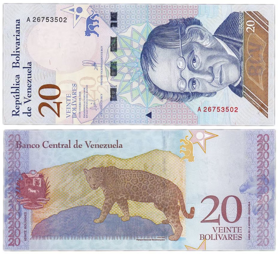 Лицевая сторона: в нижнем поле банкноты изображение портрета Симона Родригеса (1769-1854) - венесуэльского философа и наставника Симона Боливара, серийный номер и номинал цифрой. В верхнем поле номинал цифрой и прописью, название государства, серийный номер, изображение ягуара, пятиконечная звезда.
