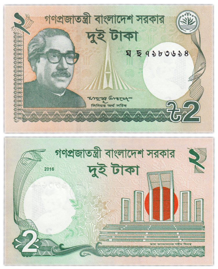 Лицевая сторона: в левом поле банкноты помещен портрет президента Бангладеш - Муджибура Рахмана, в центре купюры монумент жертвам Освободительной войны, возведенный в 1982 году в городе Савар и подпись министра финансов страны.