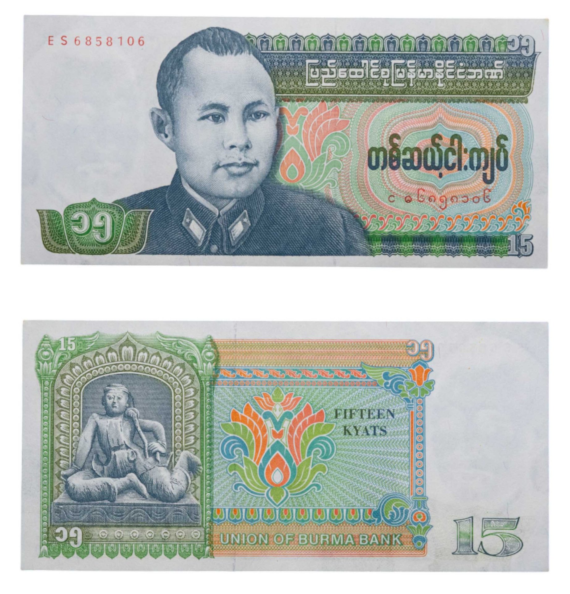 Бирма 15 кьят 1986 год "Генерал Аунг Сан. принц Мир Хан" Pick 62