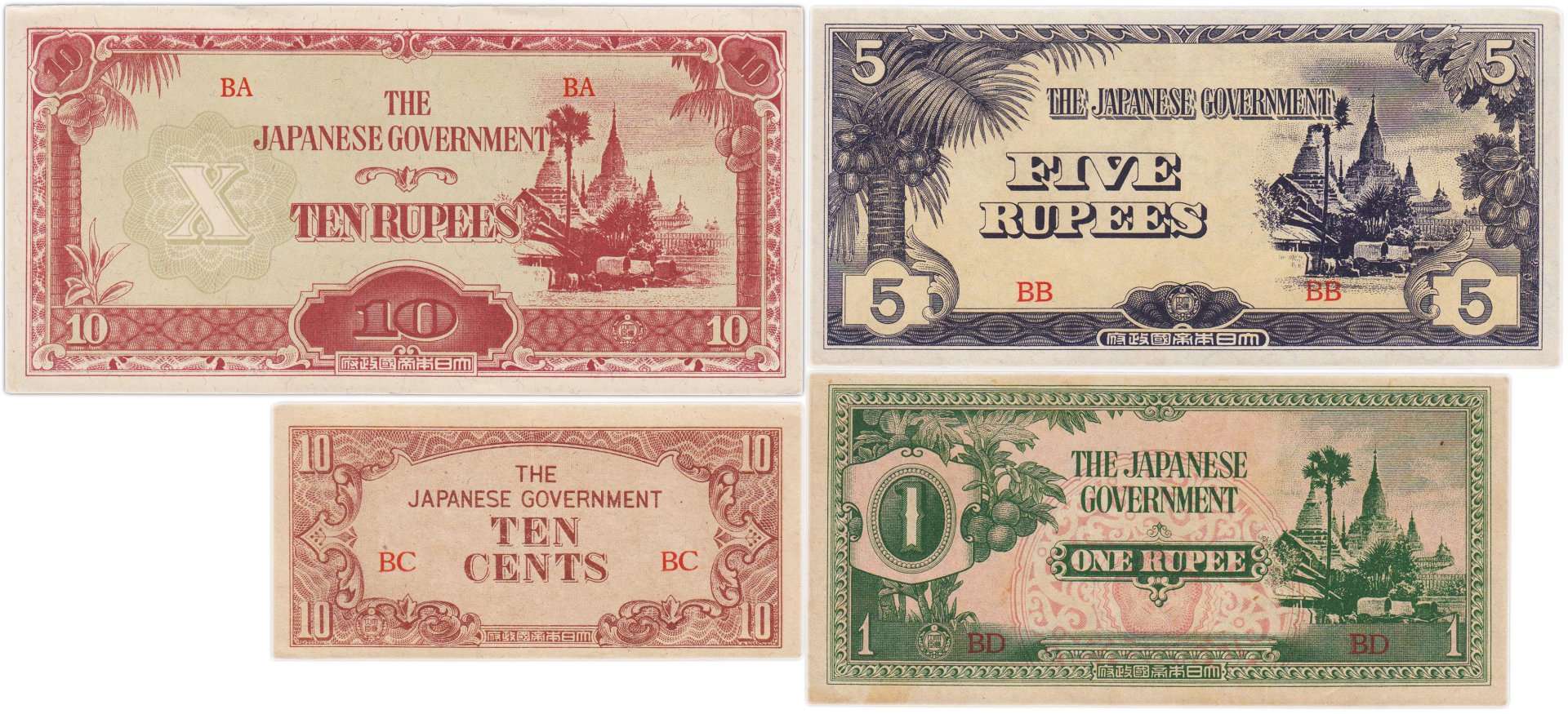 Купить Бирма (Японская оккупация) набор из 4 банкнот 50 центов и 1, 5, 10 рупий 1942-1944