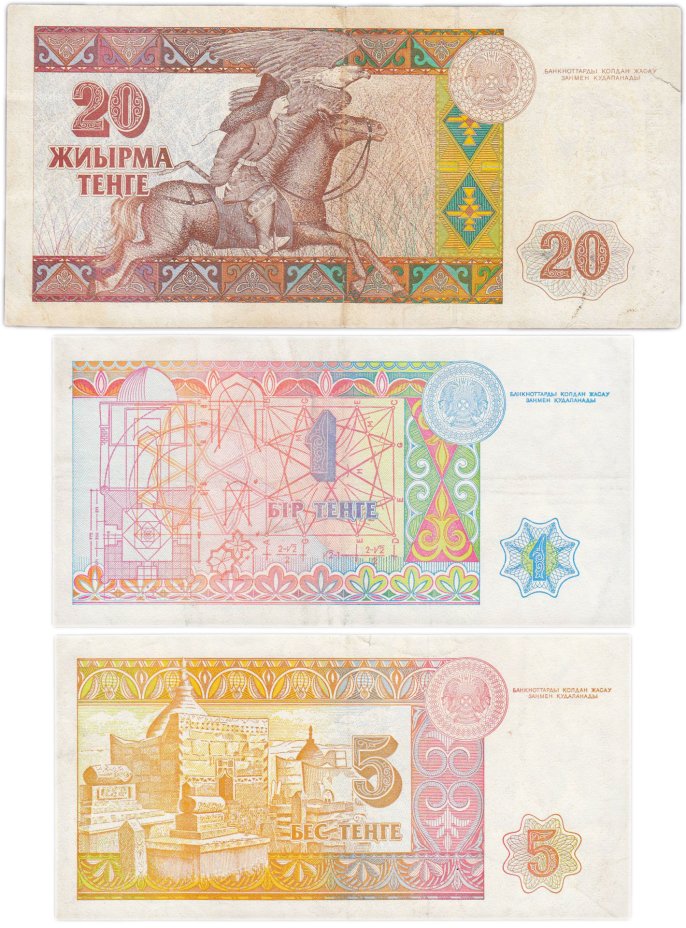 После обретения независимости в казахском государстве задумались о введении своей валюты. Советские и российские денежные знаки в конце 1993 года сменила национальная валюта - казахстанский тенге (KZT) = 100 тиына. При этом, обмен проводился в соотношении 500 рублей СССР или РФ = 1 тенге. Интересно то, что первые бумажные денежные знаки отпечатали в Великобритании и это были банкноты номиналом: 1, 2, 5, 10, 20, 50 тиына. Сегодня эти боны встречаются редко даже в коллекциях бонистов. В 1995 году в стране появилась своя фабрика по производству национальных купюр. С 1995 по 2003 годы на ней были выпущены: 1, 3, 5, 10, 20, 50, 100, 200, 500, 1000, 2000, 5000 и 10000 тенге.