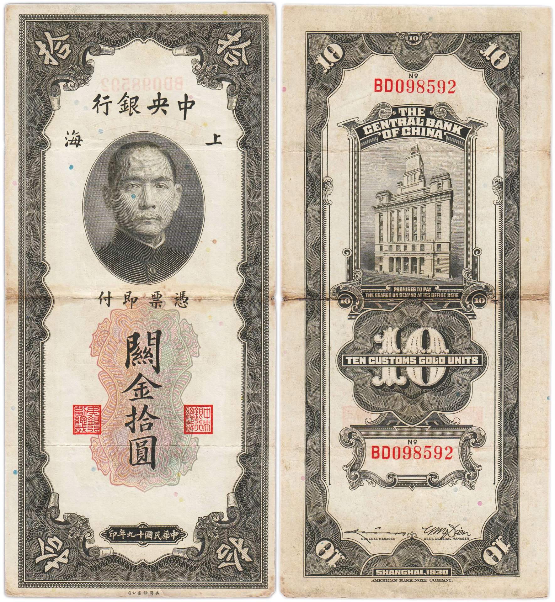 Китай (Шанхай) 10 золотых таможенных единиц 1930 The Central Bank Of China