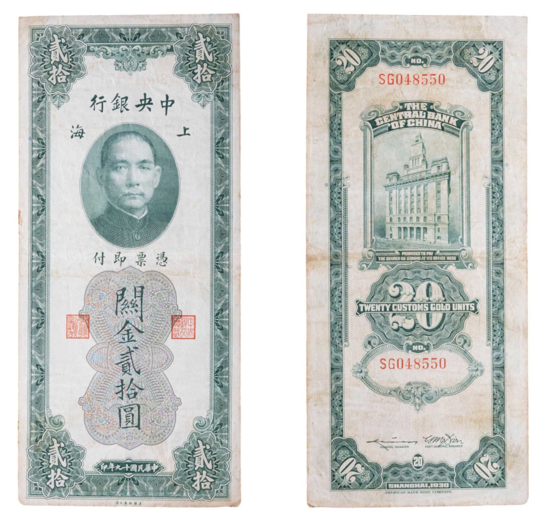 Китай (Шанхай) 20 золотых таможенных единиц 1930 The Central Bank Of China
