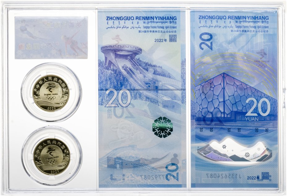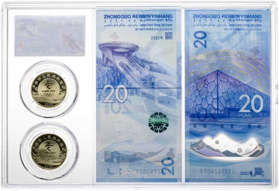 Китай полный олимпийский набор 2 банкноты и 2 монеты "XXIV зимние Олимпийские игры, Пекин 2022" 20 юаней 2022 и 5 юаней 2022