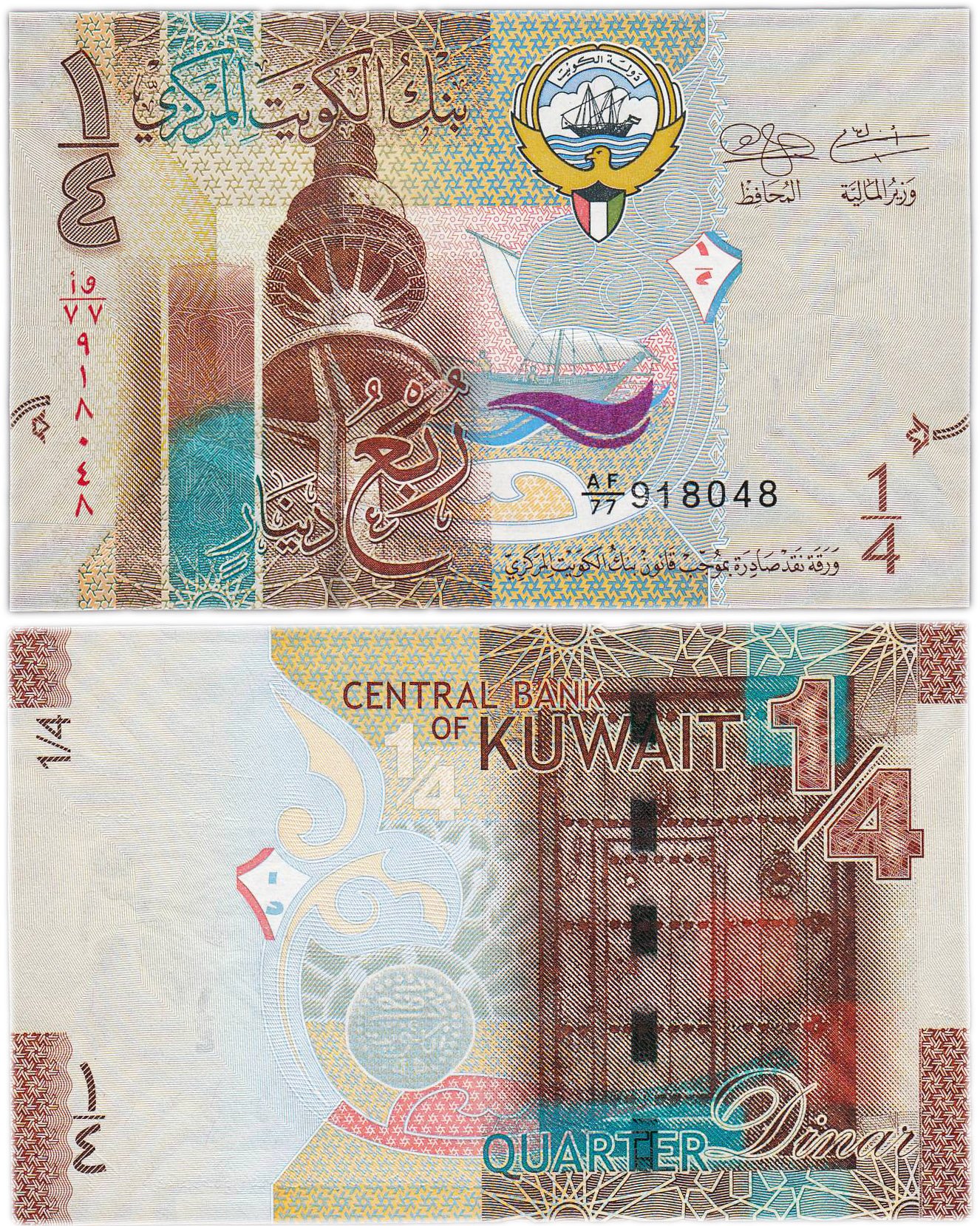 Дизайн банкнот кувейтских динар типичен для арабских стран, выполнен в спокойных, сдержанных тонах, с присутствием надписей на арабском языке.