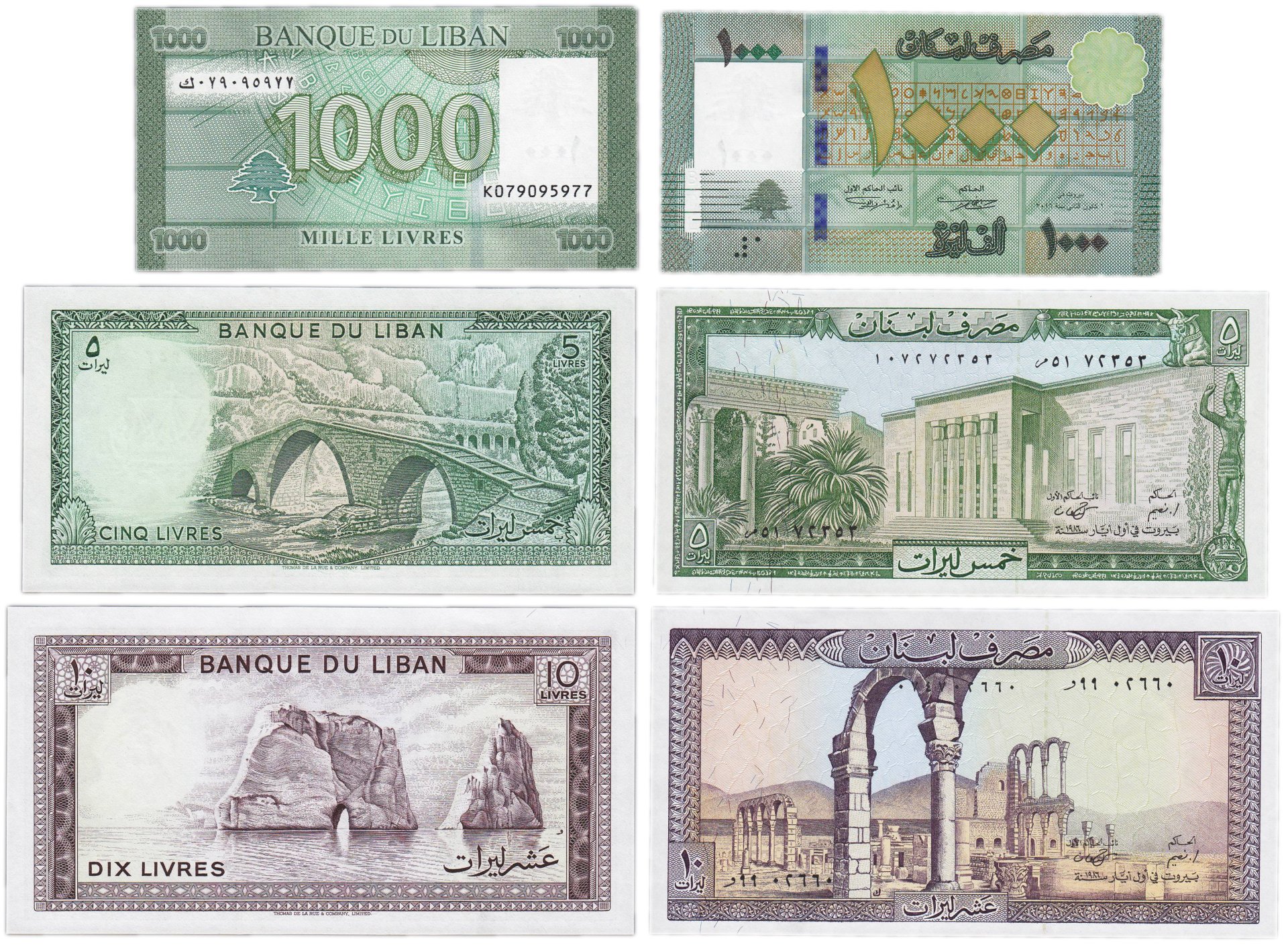Лицевая сторона: в центре банкноты изображение руин древнего ливанского города Анжар, уникального исторического места в долине реки Бекаа. Надписи и обозначение номинала на арабском языке. Оборотная сторона: Большие камни в воде неподалеку от Бейрута, сверху наименование банка, снизу номинал прописью, в верхних углах - цифрой.