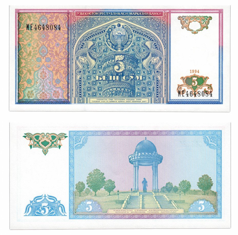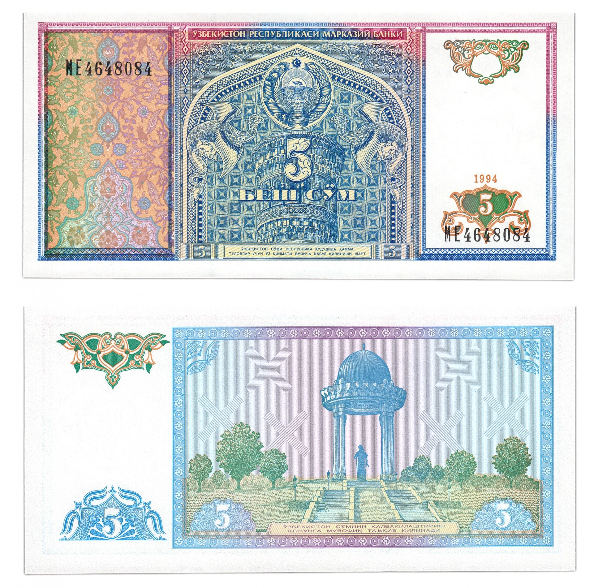 Узбекский сум – официальная денежная единица Республики Узбекистан. После провозглашения независимости страны 31 августа 1991 года национальная валюта была введена наравне с рублем. А в 1994 году состоялся выпуск первой серии банкнот - сумов, ставших официальной основной денежной единицей Узбекистана. К этой серии банкнот и относится представленная купюра 5 сум. Она находилась в обращении с 1 июля 1994 года по 1 января 2012 года.