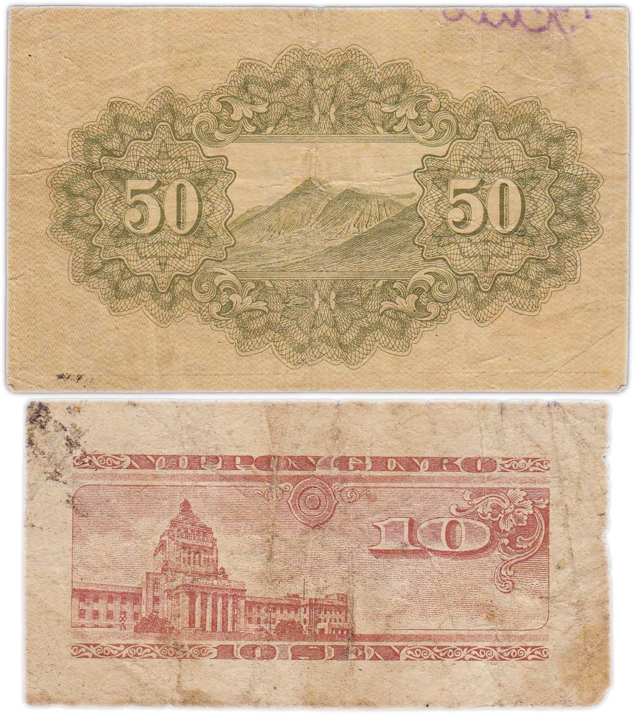 купить Япония набор из 2 банкнот 10 и 50 сен 1945-1947