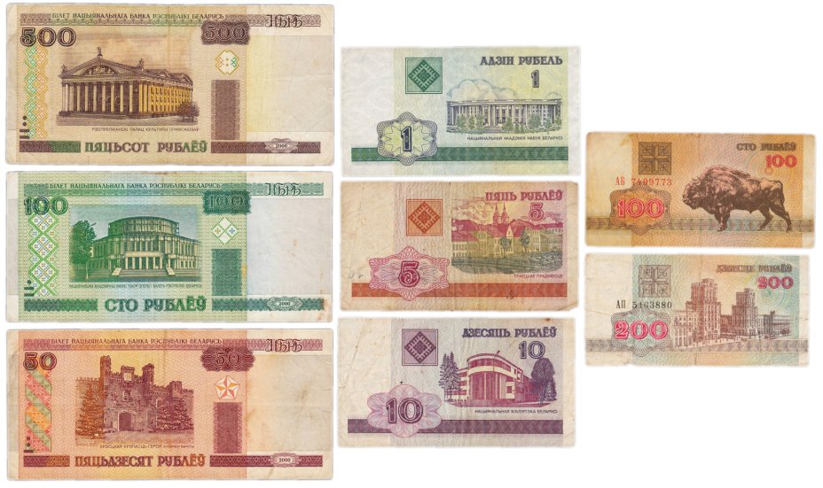 Беларусь набор из 8 банкнот 1, 5, 10, 50, 100, 200, 500 рублей 1992-2000