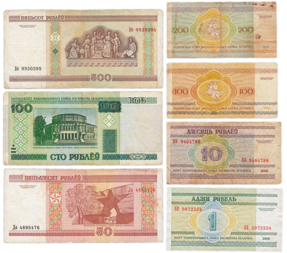 Беларусь набор из 7 банкнот 1, 10, 50, 100, 200, 500 рублей 1992-2000
