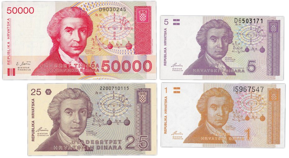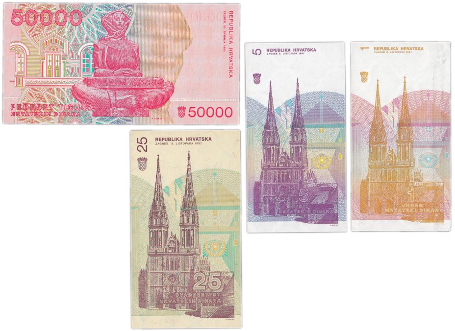 Хорватия набор из 4 банкнот 1, 5, 25, 50000 динаров 1991-1993