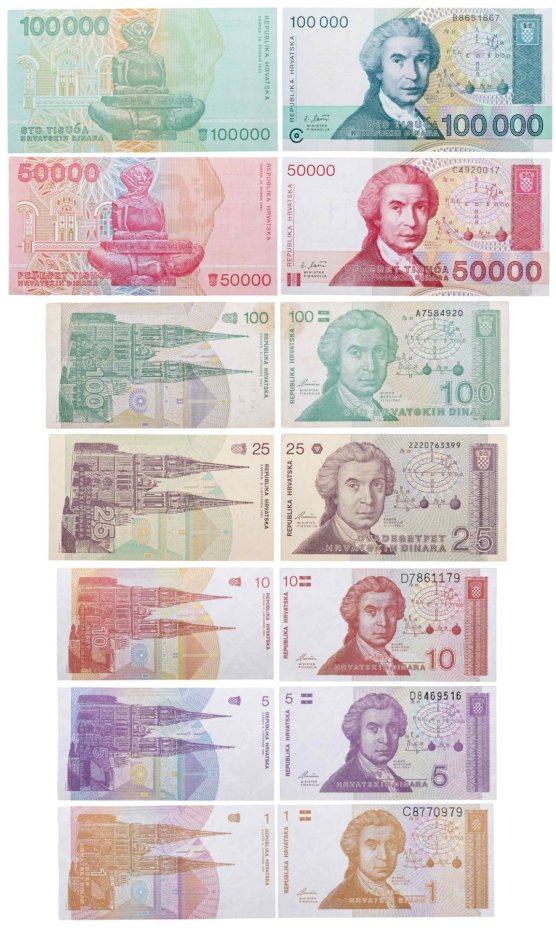 Хорватия набор из 7 банкнот 1, 5, 10, 25, 100, 50000, 100000 динар 1991 - 1993
