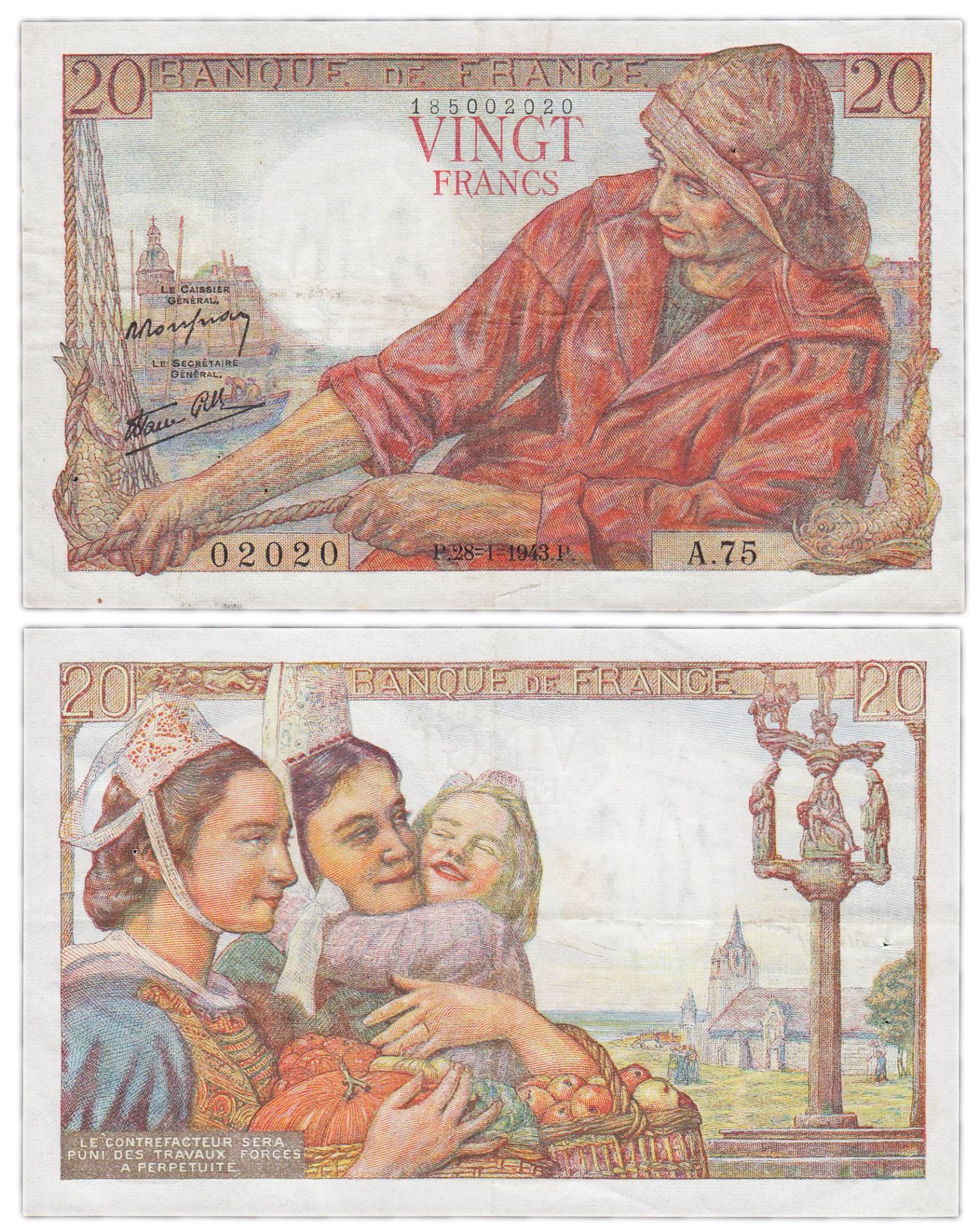 Купить Франция 20 франков 1942-1950 (Pécheur, Рыбак) Pick 100