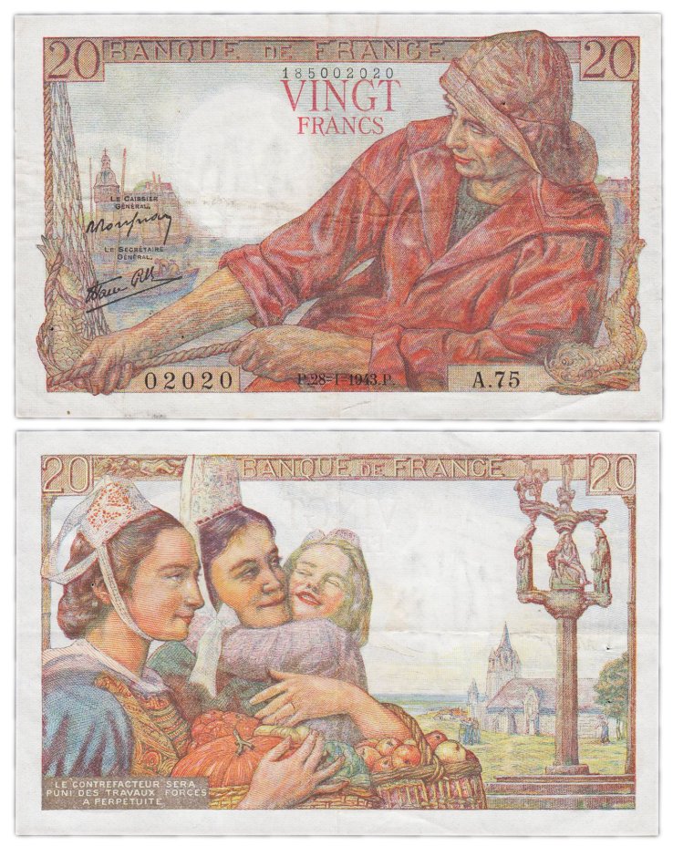 Франция 20 франков 1942-1950 (Pécheur, Рыбак) Pick 100
