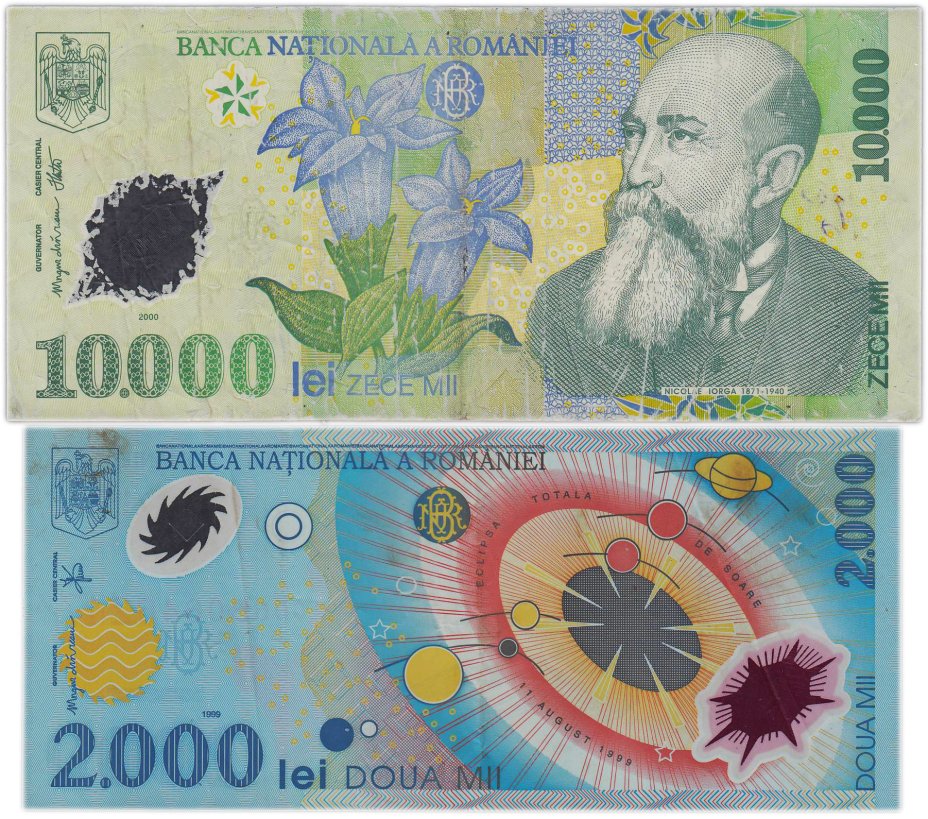 Румыния набор из 2 банкнот 2000 и 10000 лей 1999-2000 пластик "Полное солнечное затмение" и "Церковь Куртя де Арджеш"