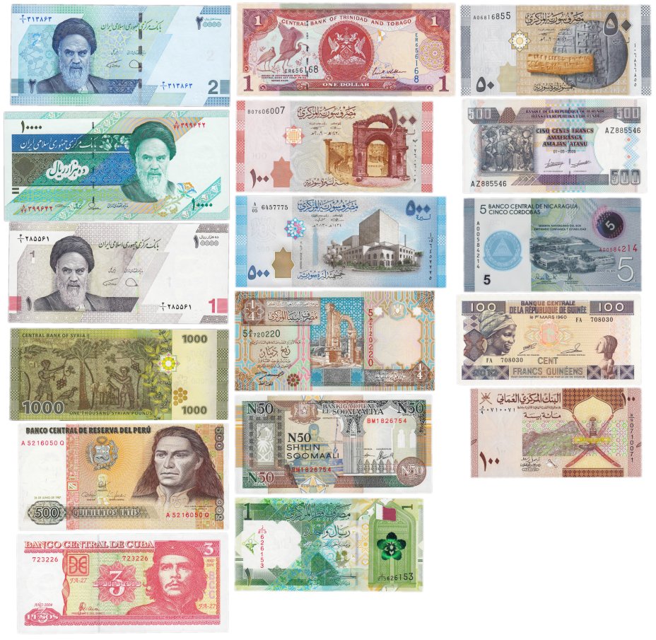 Вот некоторые страны которые встретятся в наборе: Китай, Камбоджа, Приднестровье, Вьетнам, Узбекистан, Сербия, Туркменистан, Монголия, Хорватия, Конго, Индонезия, Мапдагаскар, Мьянма, Узбекистан, Малави, Белоруссия Эритрия, Сирия, Северная корея, нигерия, непал, бангладеш, северная македония, тринидад, румыния, венесуэла, аргентина, гаити, ирак, иран, зимбабве, шри ланка, египет и другие не менее интересные страны.