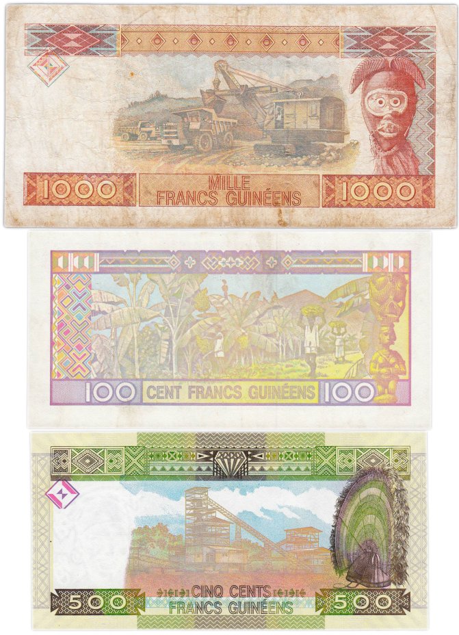 Гвинея набор из 3 банкнот 100, 500, 1000 франков 1985-2017