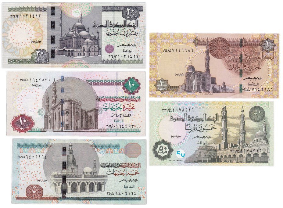 Египет набор из 5 банкнот 1, 10, 20 фунтов, 25, 50 пиастр 2005-2017