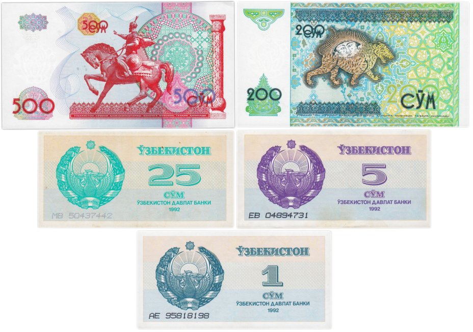 Набор Узбекистан набор из 5 банкнот 1, 5, 25, 200, 500 сум 1992-1999