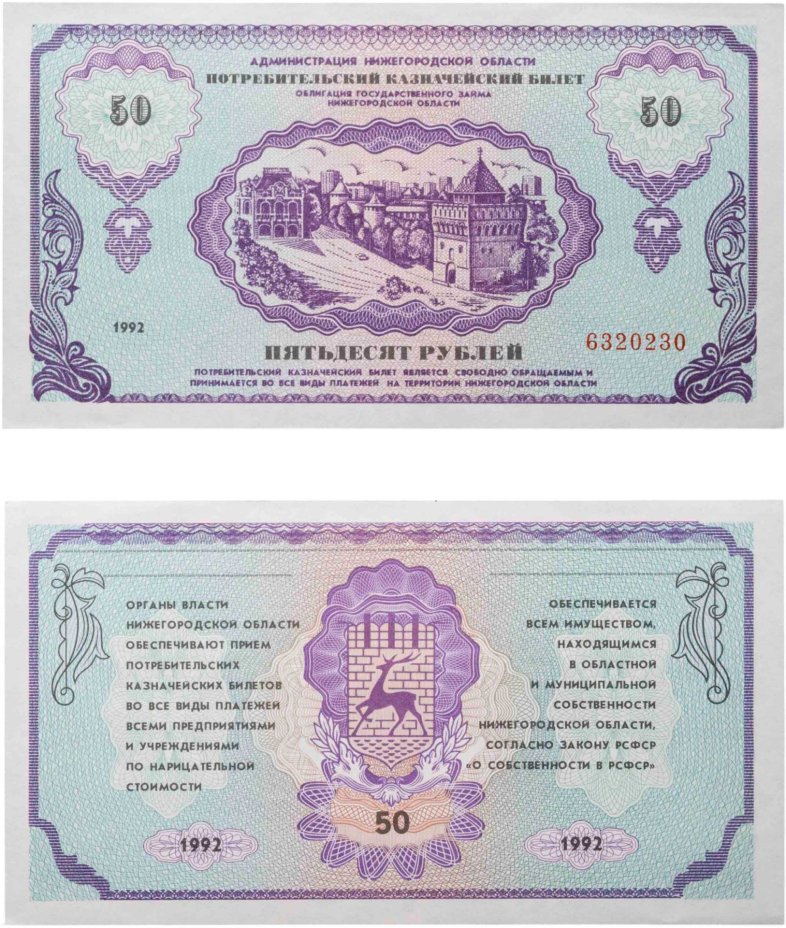 Казначейский билет / облигация государственного займа Нижегородской области (т. н. «Немцовка») достоинством в 50 рублей (1992 г.)