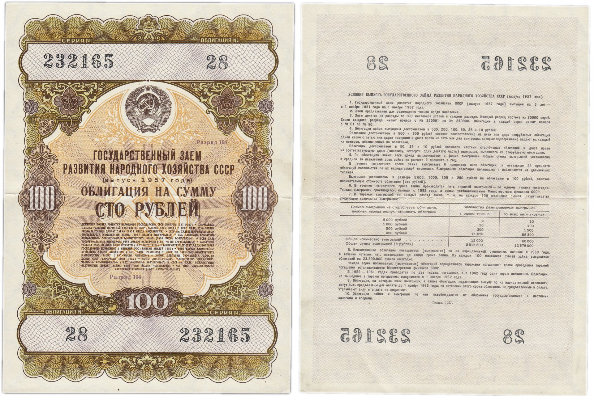 Облигация 100 рублей 1957 Государственный заем развития народного хозяйства СССР