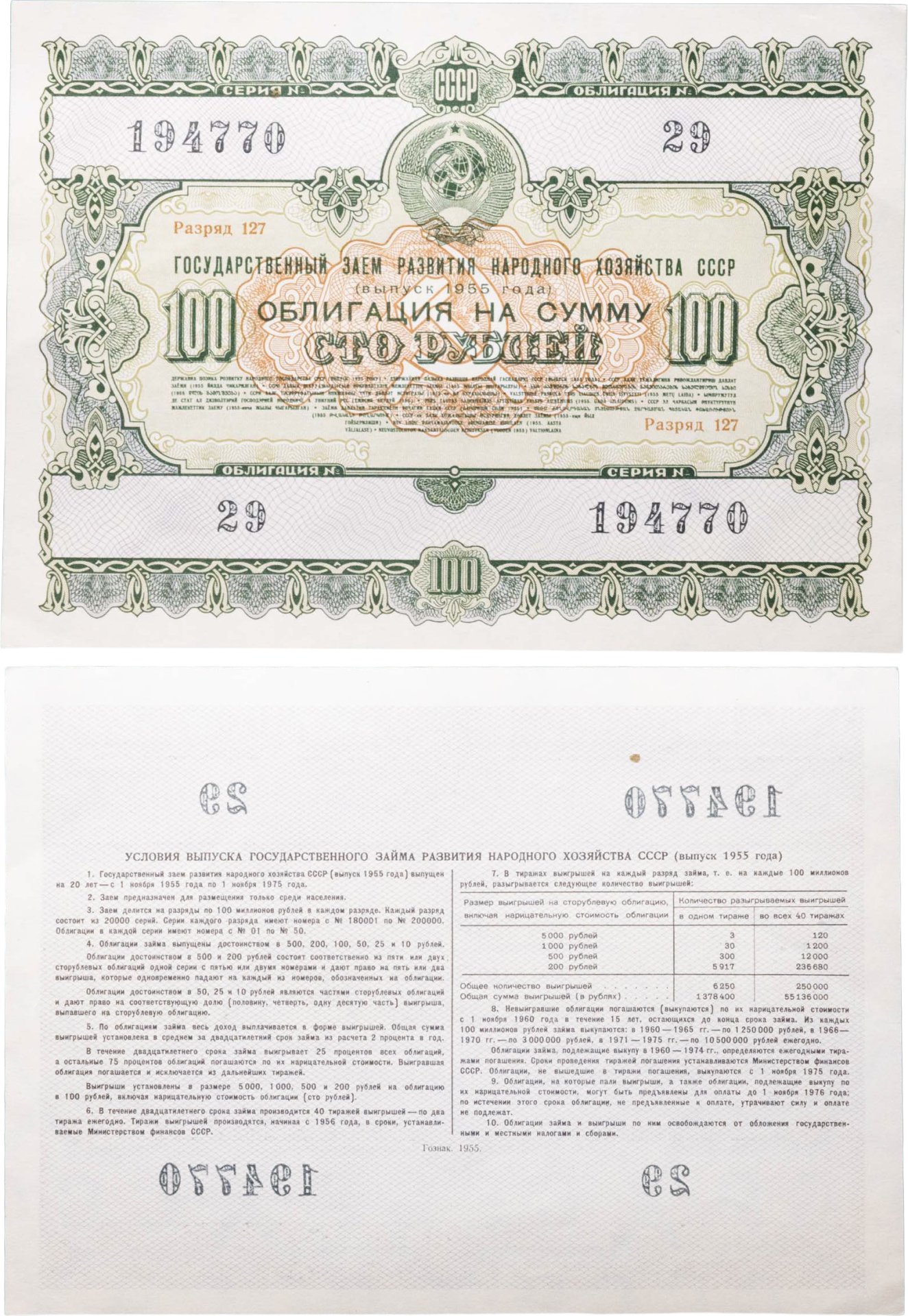 Облигация 100 рублей 1955 (1975) Государственный заем развития народного хозяйства СССР