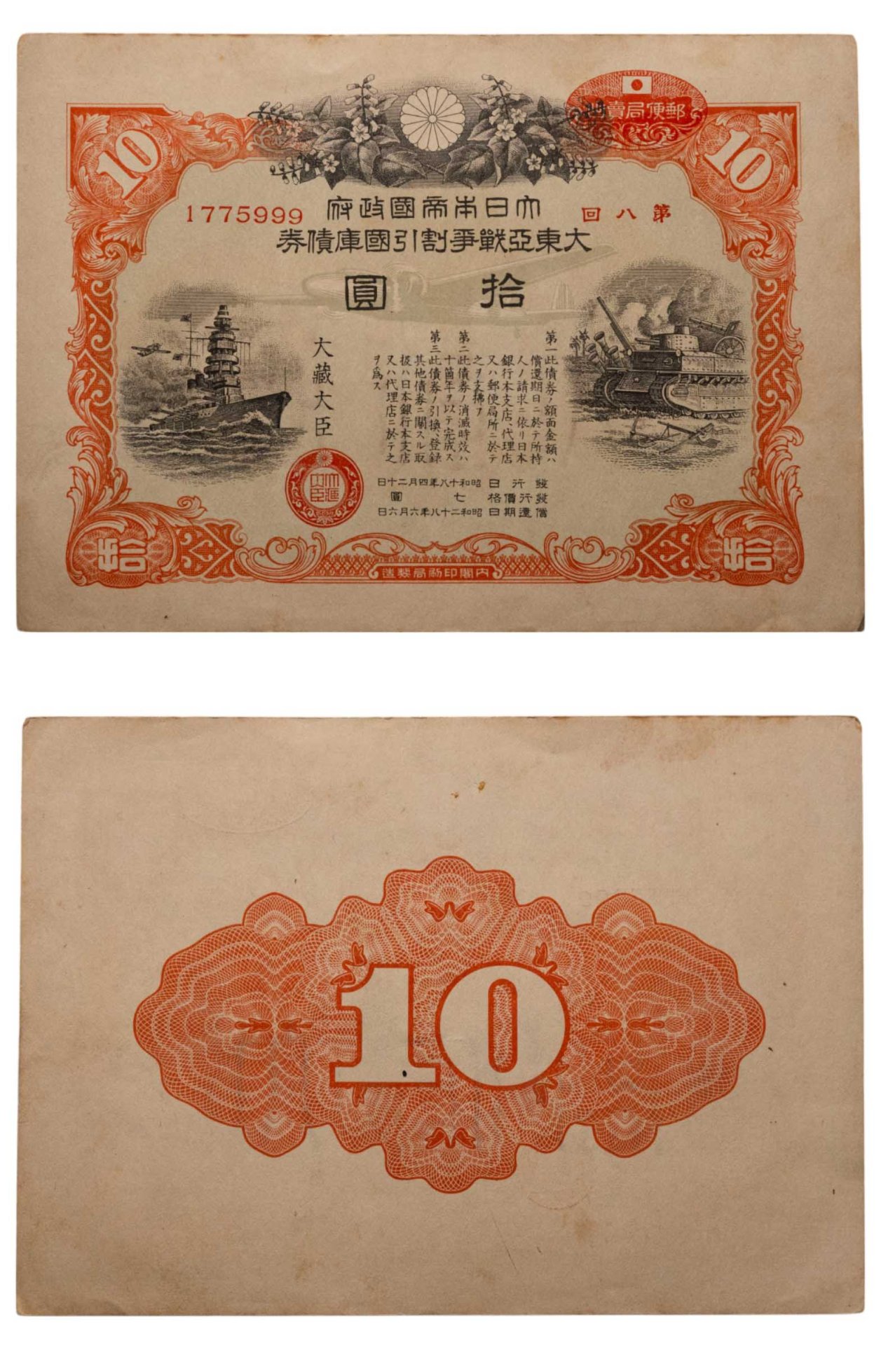 Япония 10 йен 1943 год Облигация императорского военного займа
