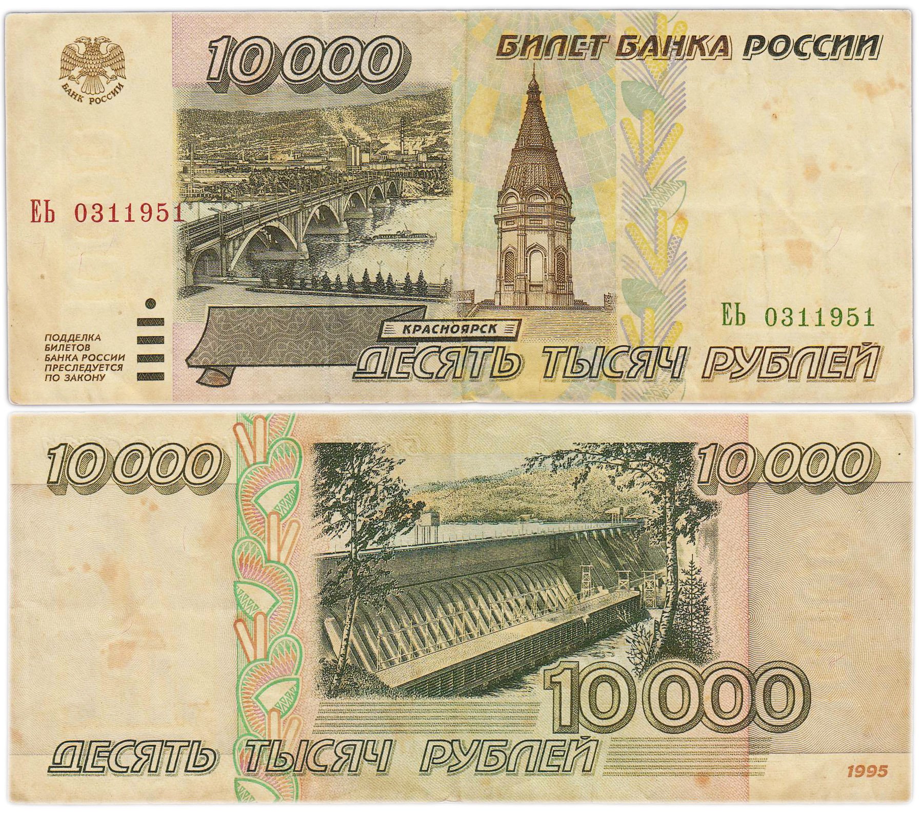 В 1995 году в России стартовала постепенная замена денежных единиц на банкноты нового образца. 29 июля 1995 года в денежное обращение страны вышла новая банкнота с солидным номиналом 10000 рублей. Эти деньги запомнились россиянам большим количеством нулей и временем «когда все были миллионерами». Такой беспрецедентный номинал объяснялся высоким уровнем инфляции. Сегодня денежные знаки имеют тот же дизайн, но после деноминации 1998 года с меньшим количеством нулей.