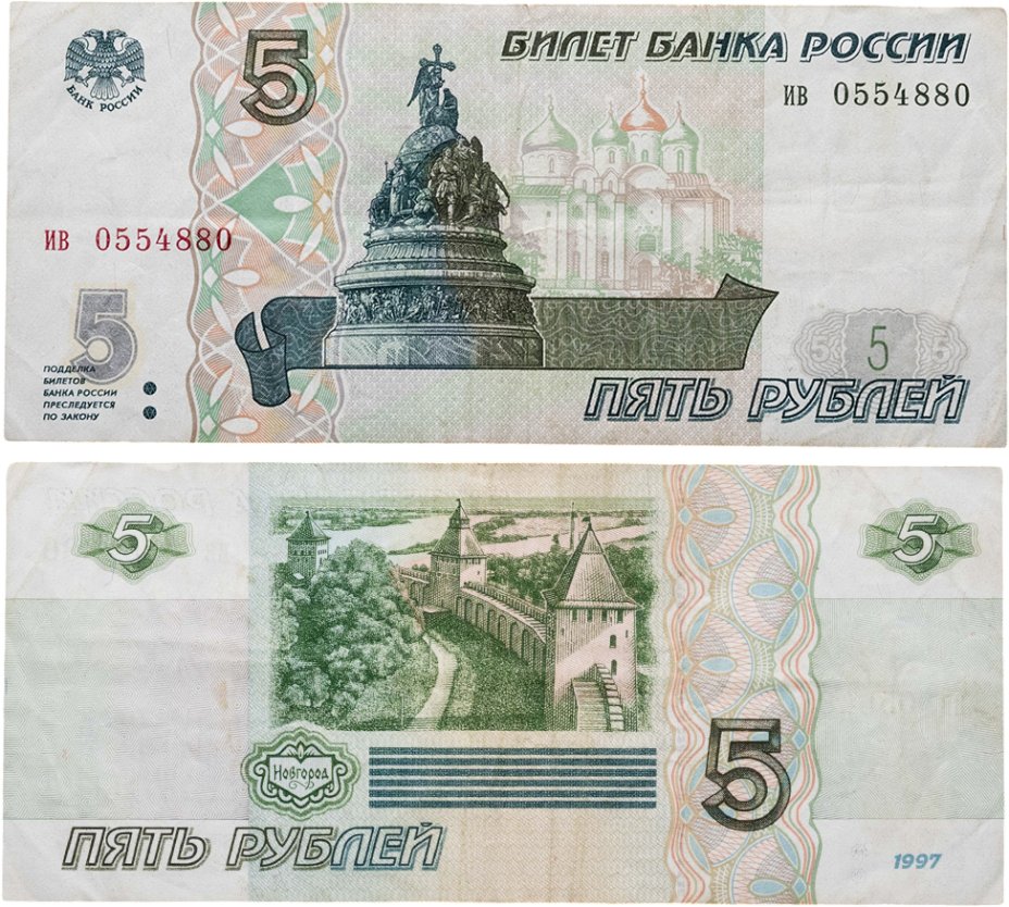 - 5 рублей. Город — Великий Новгород, цвет — тёмно-зеленый;