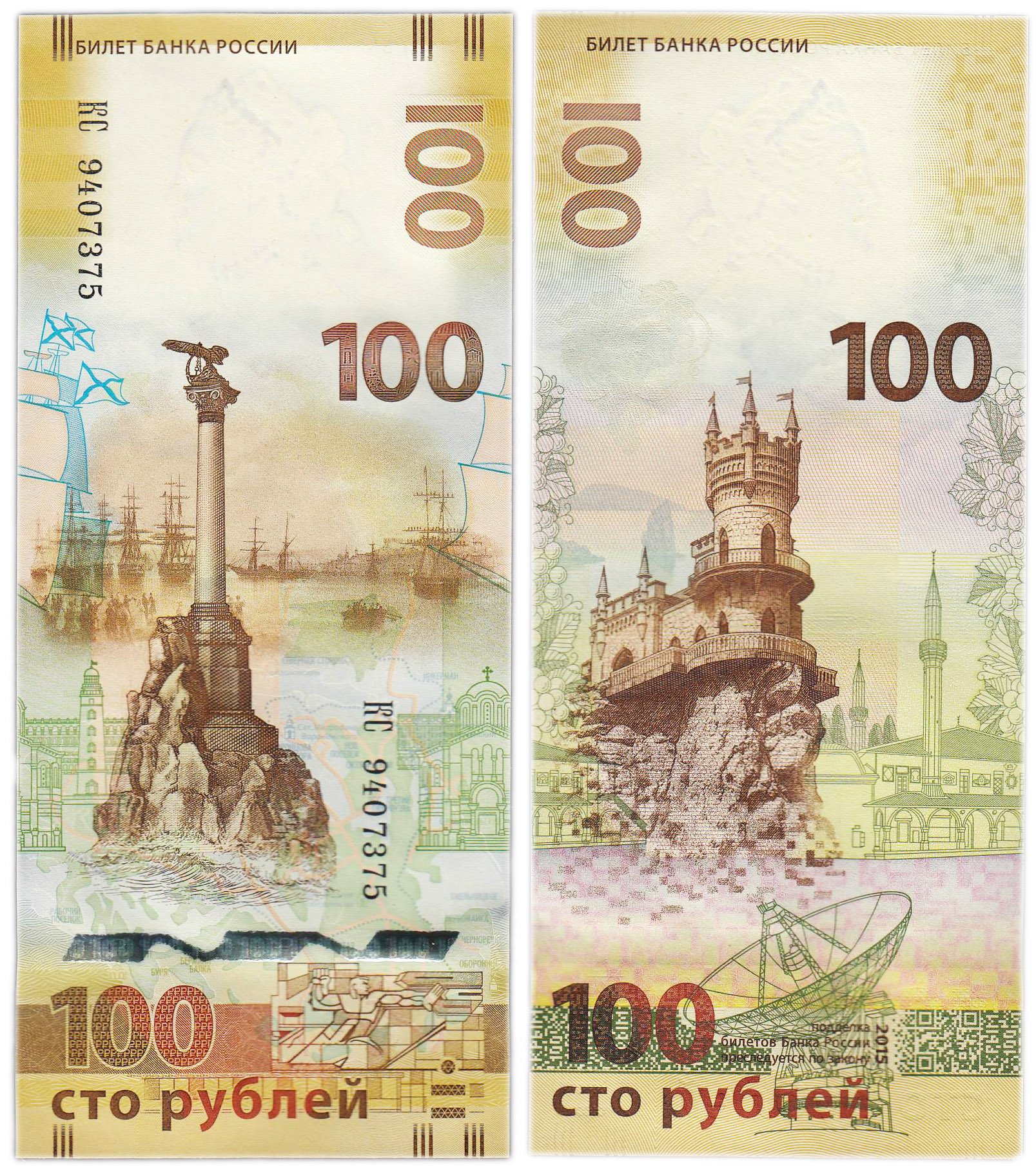 Воссоединение Республики Крым и города Севастополь с Российской Федерацией в 2014 году было решено отметить не только монетами, но и купюрой, которая продолжила серию памятных купюр, начатую сторублёвкой "Сочи-2014". В оборот банкнота поступила 23 декабря 2015 года. Такой долгий срок объясняется тщательной проработкой рисунка, учитывающей как исторические вехи Крыма, так и его современные особенности. Тираж выпуска составил 20 000 000 экземпляров.