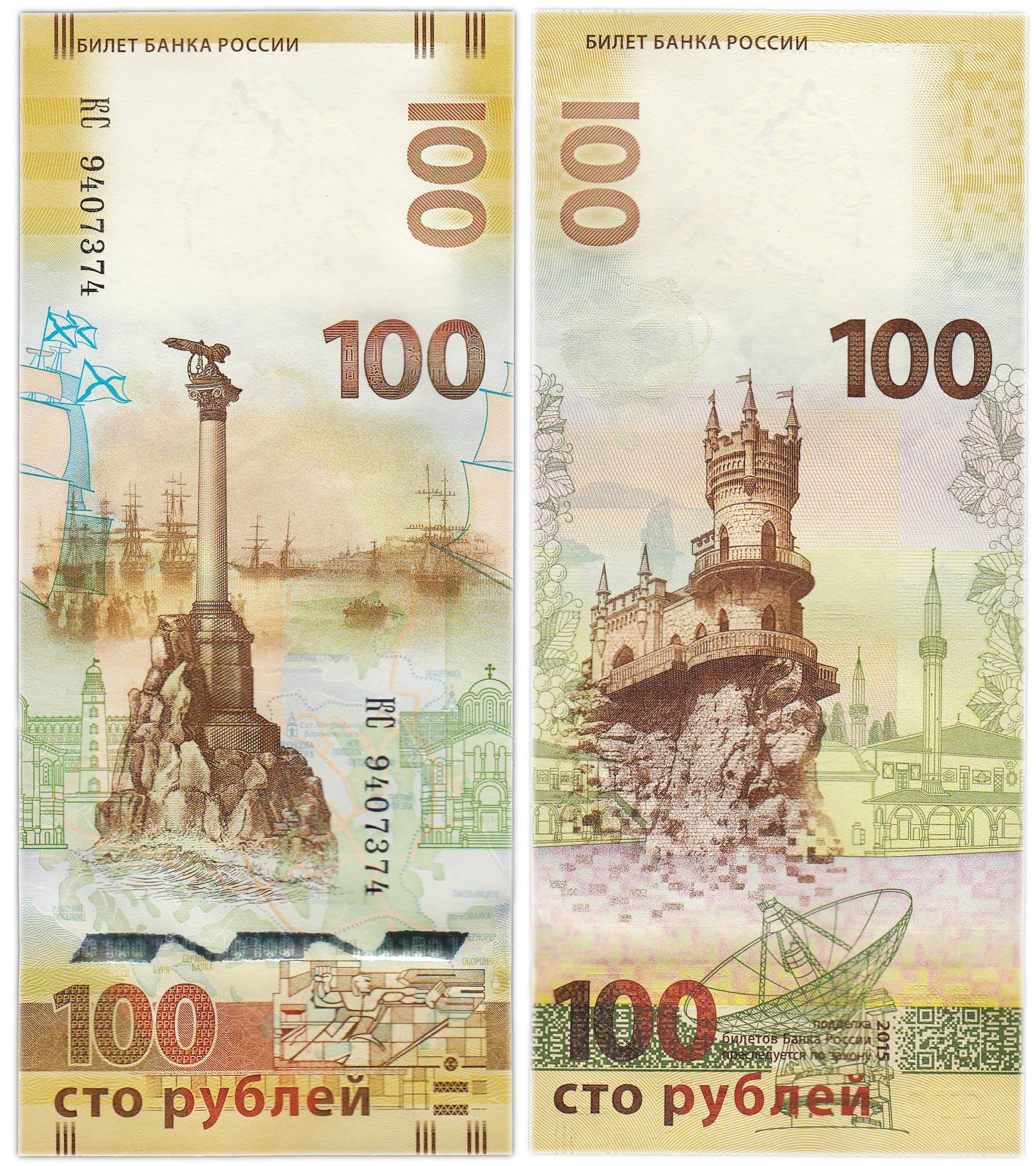 Воссоединение Республики Крым и города Севастополь с Российской Федерацией в 2014 году было решено отметить не только монетами, но и купюрой, которая продолжила серию памятных купюр, начатую сторублёвкой "Сочи-2014". В оборот банкнота поступила 23 декабря 2015 года. Такой долгий срок объясняется тщательной проработкой рисунка, учитывающей как исторические вехи Крыма, так и его современные особенности. Тираж выпуска составил 20 000 000 экземпляров.