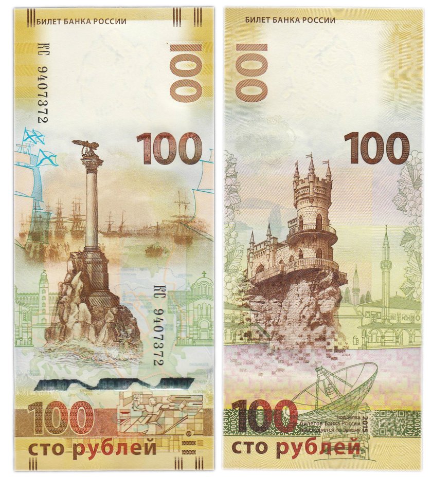 • Воссоединение Республики Крым и города Севастополь с Российской Федерацией в 2014 году было решено отметить не только монетами, но и купюрой, которая продолжила серию памятных купюр, начатую сторублёвкой "Сочи-2014". В оборот банкнота поступила 23 декабря 2015 года. Такой долгий срок объясняется тщательной проработкой рисунка, учитывающей как исторические вехи Крыма, так и его современные особенности. Тираж выпуска составил 20 000 000 экземпляров.